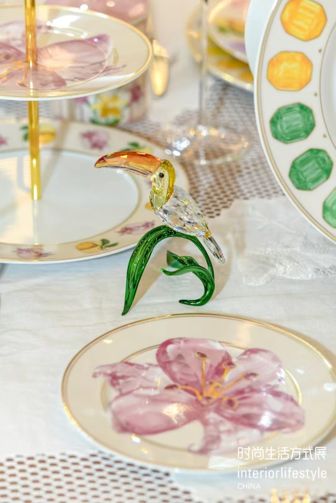 现场亦备受瞩目的是作为德国知名陶瓷品牌Rosenthal 与 奥地利知名水晶品牌Swarovski 施华洛世奇联合推出的又一力作,IDYLLIA伊蒂利娅系列。该系列堪称 “瓷器与水晶的艺术对话”,从自然之美中汲取灵感,Swarovski广受喜爱的花卉和鸟类水晶雕像通过Rosenthal独特的工艺和印刷技术被呈现在瓷器上,鲜明的色调、精细的图案,雕刻施华洛世奇标志性天鹅图案的水晶装饰在灯光下熠熠生辉,构成日常家居空间里的闪耀晶瓷世界,光彩无限。