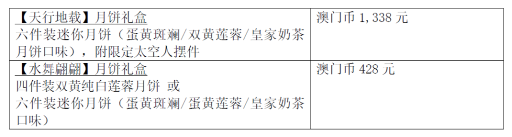 宾客可凭《水舞间》门票尊享八五折优惠。兩款月饼礼盒的购买地点:澳门新濠天地各自营餐厅及水舞间剧院精品店。
