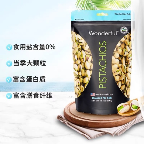欢欣之余,人们也愈加注重饮食健康与平衡。万多福开心果始终坚持精选在加州充沛阳光照射下自然成熟的当季大颗粒开心果,拥有奶黄色外壳、紫色果衣和绿色果仁。万多福 300 克经典无盐味开心果,配料仅含开心果,做到0%添加食用盐,适合忠于原味的朋友们品味来自大自然的馈赠。轻轻一咬,唇齿间便能感受香醇口感,带来纯粹的味觉体验。万多福开心果同时兼顾味蕾需求和营养摄入,富含蛋白质和膳食纤维,是大家拥抱健康生活方式的理想之选。