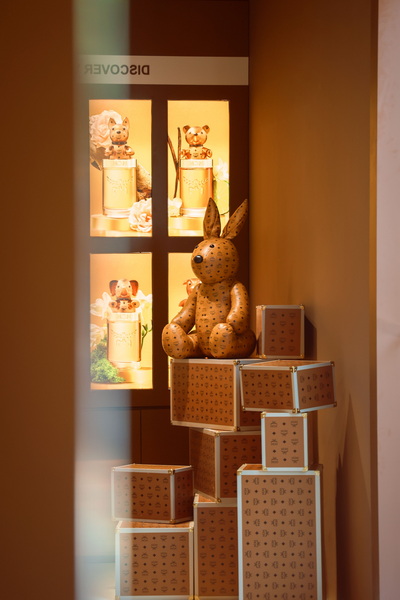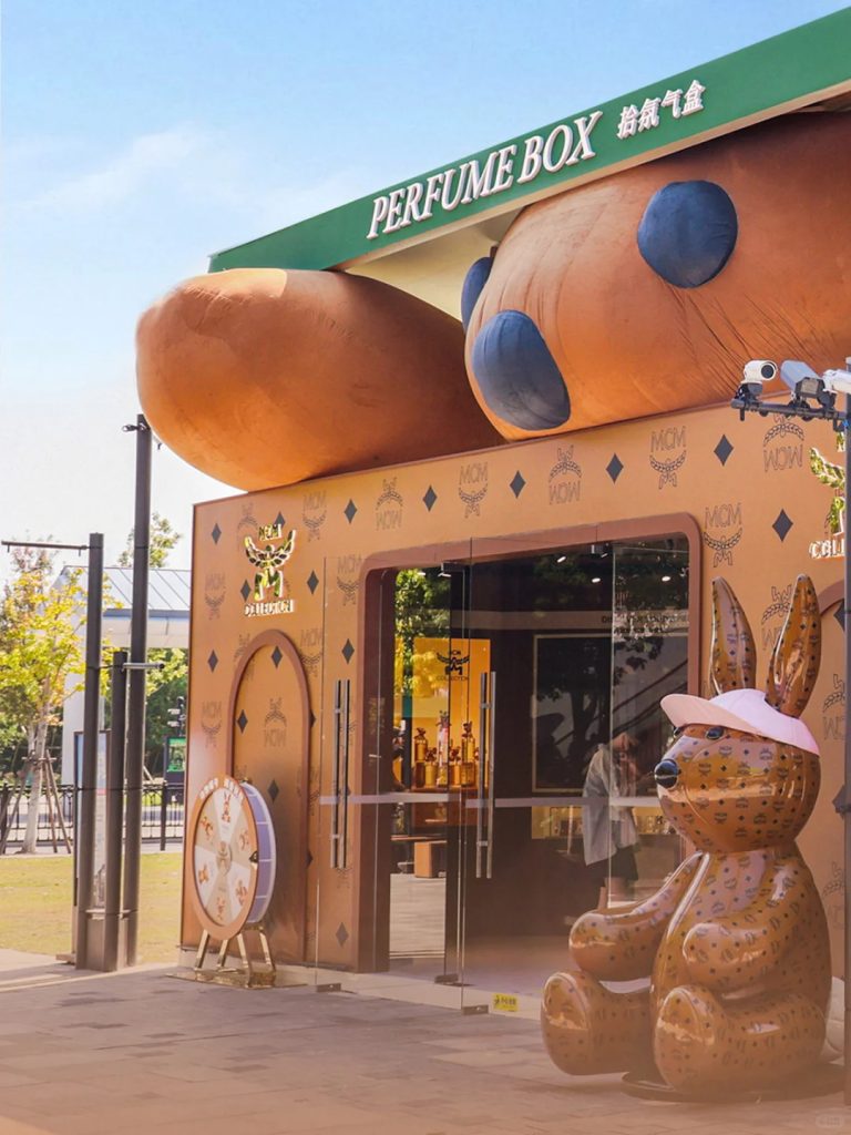 空间以巨型香水瓶艺术装置为视觉中心,PERFUME BOX标志性“盒子”中探出MCM经典熊宝,与一旁的巨型兔宝相映成趣,营造出探秘般的游猎氛围,引导观众步入一场“气味游猎”之旅,在解压生活压力的同时,探寻到契合自身的灵魂香气。