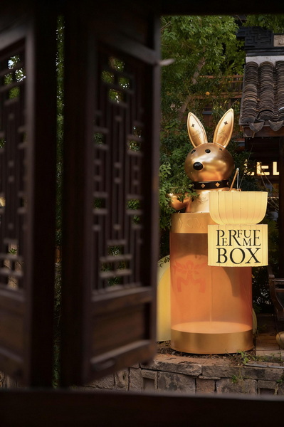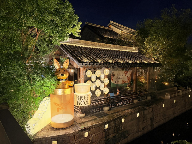 例如,中秋期间,PERFUME BOX拾氛气盒巧妙提取MCM欢悦兔宝香水的灵动意象,于蟠龙新天地标志性的香花桥打造“香跃兔”灯光艺术装置,将现代香氛造型与传统灯笼意象相融合,形成“灯中有香,香中有光”的节日焦点。此举不仅点亮了水乡的中秋夜景,更让香气以视觉艺术的形式,成为连接传统与当代的公共情感媒介。
