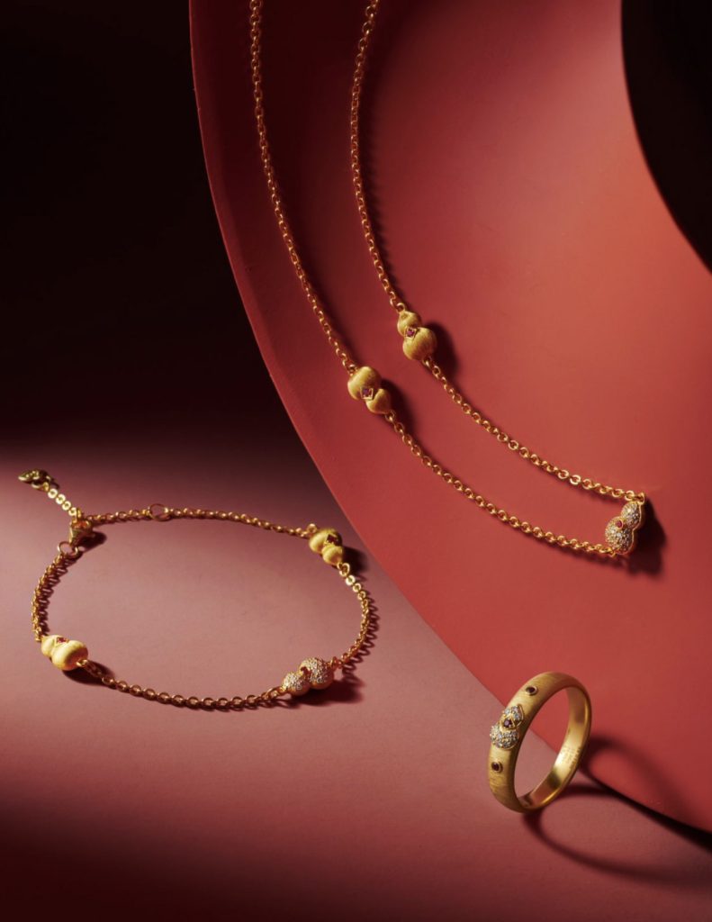 中国传统文化中,莲花与葫芦是寓意深远的祥瑞元素,自古至今都被人们广泛地运用。从紫禁城的金银器皿,到普陀山的佛塔之尖,再到豫园的湖心亭宝顶,它们已然成为印刻在人们心中的文化记忆,承载着世代相传的祝福与期盼。老庙承袭品牌的“好运基因”,融合莲花与葫芦两大意象,打造出独具辨识度的好运符号,喻示广纳吉运、圆满顺遂的美好愿景。