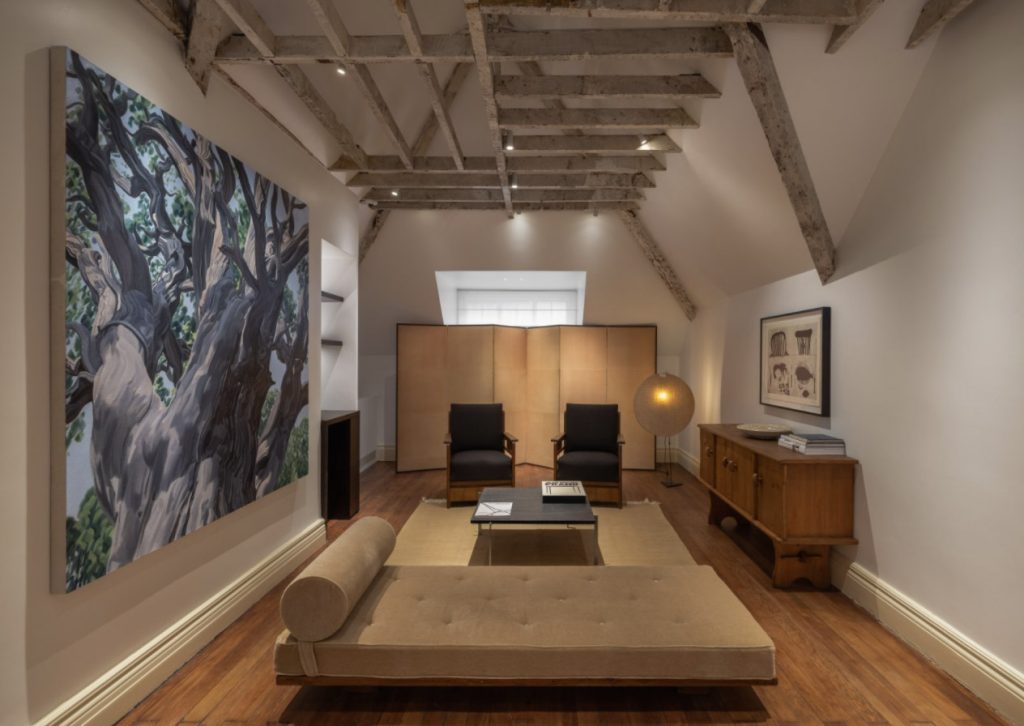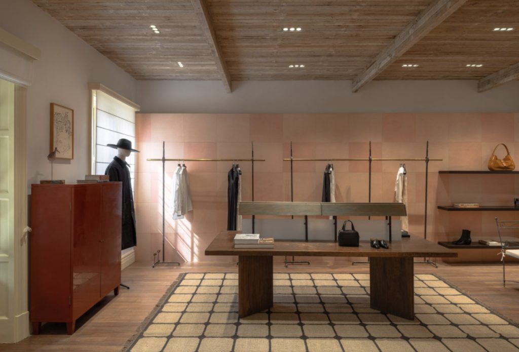 新店的每一处空间细节,皆是棟梁一贯理念的无言注脚:以跨越时间的审美,传承经典与手工艺,温和地对抗着潮流的变迁。设计团队将非遗与传统物料精心编织于当代零售体验的语境之中——浏阳夏布垂落为帘,茶染勾勒标识,一扇源自明清的苏州老门静立其间,其上明瓦由河蚌背壳磨就,漾着温润光阴,通往茶皿器物零售空间的门廊则点缀着太湖石与石榴花形木雕。新馆多处墙面裱以手工宣纸,试衣间屋顶取材于老洋房的木制地板,木纹斑驳如岁月诗行。零售场域内可见由棟梁团队自主设计的陈列元素,木质展示架由榫卯结构组合而成,手工捶打的铸铁陈列挂架其温润质感与建筑肌理相融,设计灵感源自新艺术运动,金色的枝叶舒展,脉络纤毫毕现,宛若自然生长,既衬托时装之美,其本身亦成为不随时光褪色的美学物件……东方静谧与诗意,于此细微处悄然生长,引人入梦。