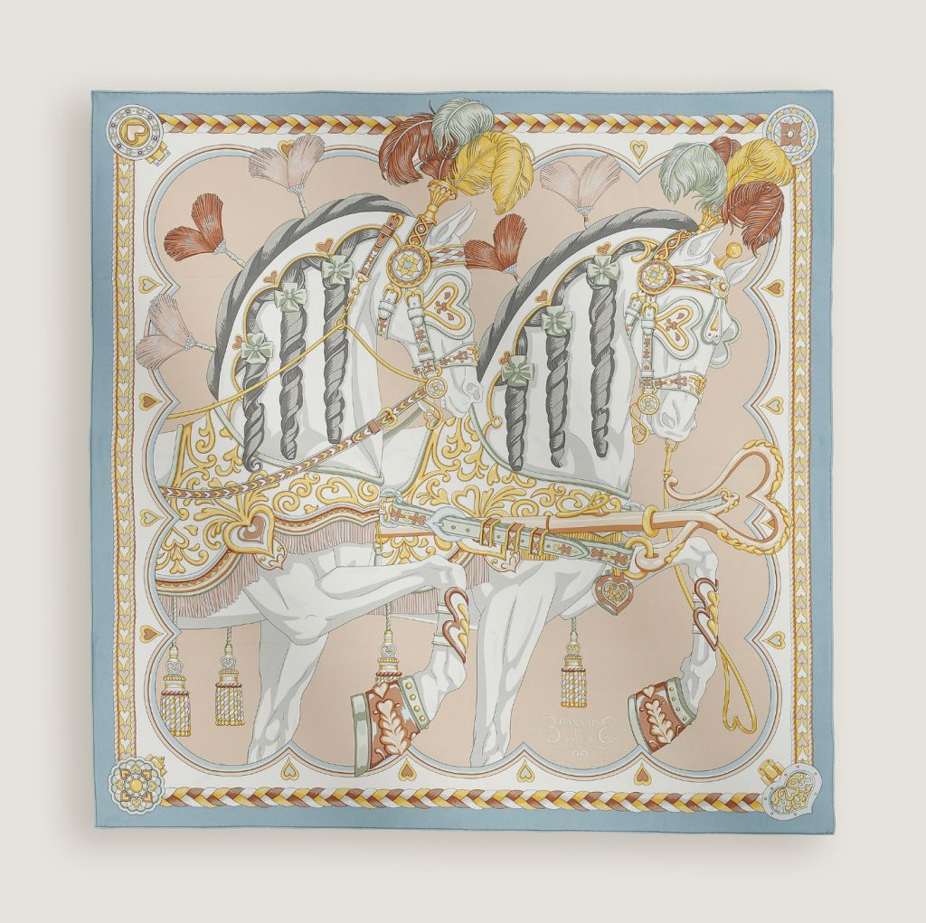 作为品牌价值的一部分,爱马仕始终忠于其人文主义价值观,在世界各地积极推行极具多样性的项目。本次推出限量 750 条的特别版方巾,将于中国大陆地区所有专卖店及官方线上渠道售卖,所得净利润将用于“乡村工匠    赋能计划”,为刺绣技艺传承事业提供支持。此次公益项目的推进,旨在进一步培育能够精通并保护传统技艺的熟练工匠,促进文化传承,助力社区发展。这款限量丝巾的设计灵感源自埃米尔·爱马仕(Emile Hermès)典藏系列中的一件历史餐盘,以骑士般的浪漫主义气息,描绘了一对羞怯恋人,心意被精美的鞍具紧紧系缚。
