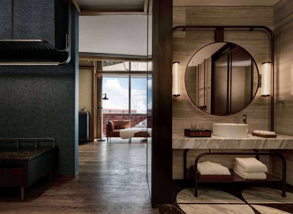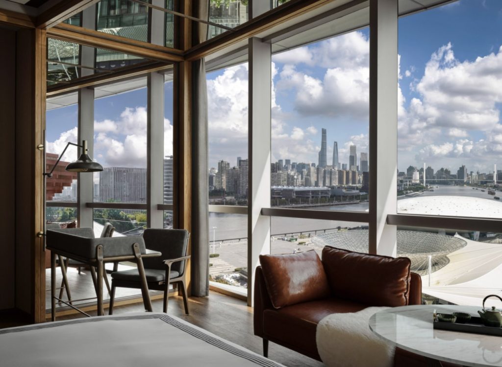 254间客房与套房延续品牌标志性的现代工业风格与居家风尚。落地窗引入江景与城市天际线,木制地板搭配手工地毯、金属细节与温暖色调的定制家具,以展馆艺术为灵感的装饰点缀其间。