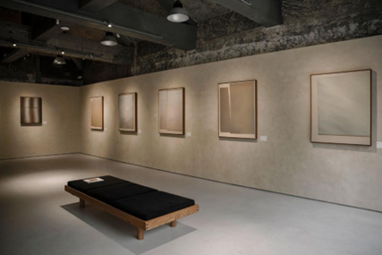 来到空间的第三层,归于宁静,弥漫沉思氛围。以极简笔触冥想姿态统领空间,情感克制却余韵悠长,成为一方静心呼吸之地。作品广阔色系统一而感知殊异,几何被陷于柔软的无边地,作品运用渐变色调模拟光线方向,仿效反射结构,与空间的结构肌理共同营造出深邃的感知。