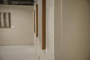 从一层至二层, 概念复杂性随之升华,遁入二层空间——通过二维技法与三维浮雕交织维度感知,材料呈现出雕塑特质;真实阴影与绘制阴影模糊边界,观者在深度中产生视觉的流动,由表及里向内质疑所见与所感。