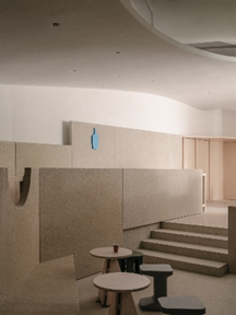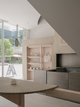 店内空间整体被温润色调的砂岩包裹,呈现细腻自然的肌理营造出仿若江畔岩层般的沉静氛围。微曲的天花板如轻柔的毛毯顺势垂落包裹,灯光从不同角度洒落,柔和勾勒出空间的轮廓与起伏,在光影交织中构筑出一个温暖静谧的“发光茧”,为陆家嘴的硬朗轮廓注入一份松弛与柔和。置身其中享用一杯咖啡,放慢节奏、与自然元素连接,寻回一隅平静。