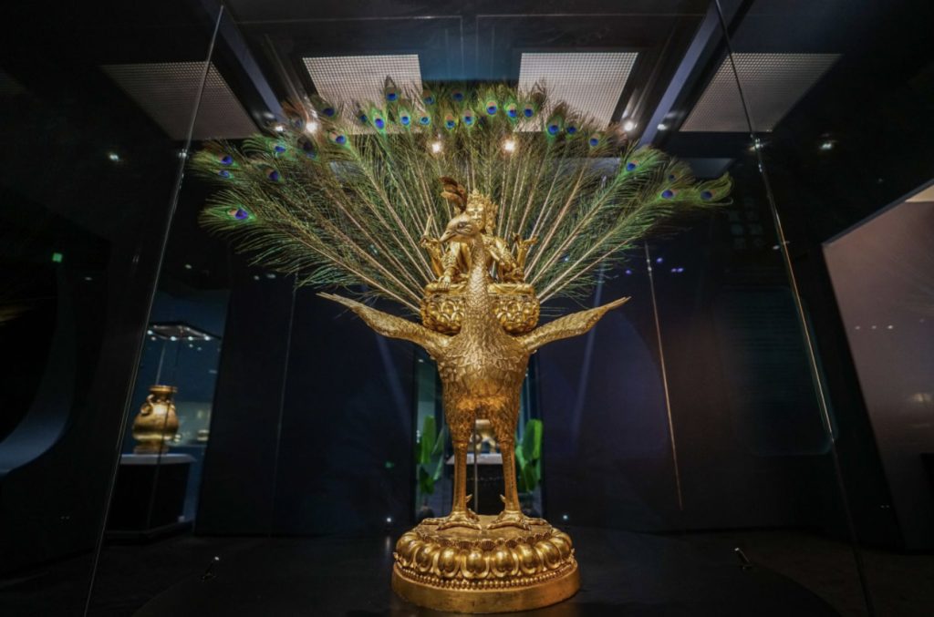 第三单元为“永宣垂范、震古耀今”。“永宣金铜造像”与“宣德炉”是明代工艺美术的杰出代表,其创新的艺术形式对后世影响深远。本单元将展出大都会艺术博物馆藏明永乐铁鋄(jiǎn)金银天杖、柏林民族学博物馆藏明宣德铜鎏金孔雀明王像、青海省博物馆藏明宣德赐瞿昙寺鎏金铜瓶等作品。
