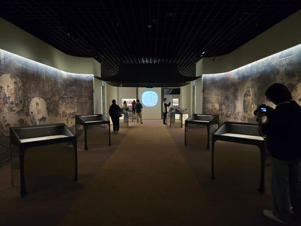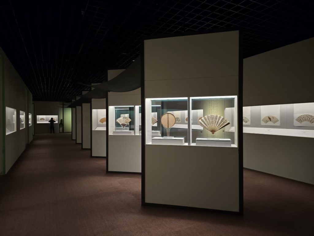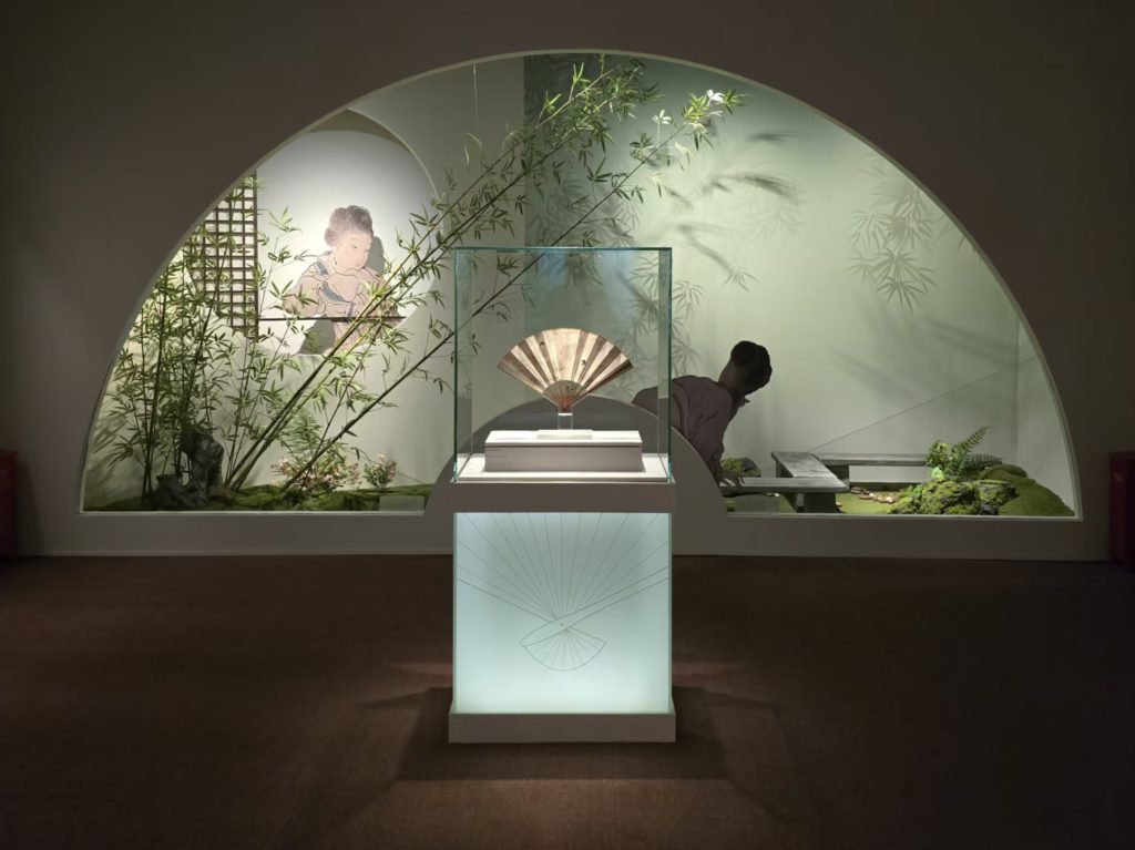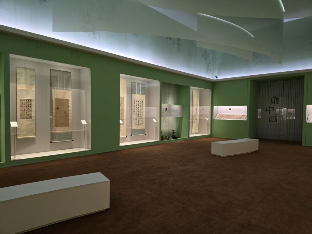 本次展览的展陈空间依据主、辅线展品的特性与时代艺术风格进行设计。主线展示聚焦扇面书画的发展脉络,空间设计融入宋式建筑、明清园林及文人书斋的美学理念,通过由大到小、由外及内的空间序列,形成连贯的观展流线。辅线展品以立轴、手卷等形式,呈现绘画中的扇文化内涵,其展示设计以“竹”为视觉元素,营造清雅意境,突出扇文化所蕴含的文人精神追求。主、辅展线在空间中穿插呼应,实现内景与外景的巧妙联动。