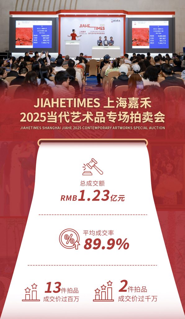 「Jiahe Times」上海嘉禾2025当代艺术品专场拍卖会于15日晚圆满结束。本次拍卖会涵盖六大板块,荟聚了188件当代艺术精品佳作。总成交额1.23亿元,成交率89.9%。作为嘉禾首度推出的当代艺术独立专场,以亮眼的成绩印证了此次盛会的成功举办,也体现了藏家们深厚的信任与支持。