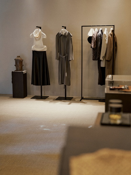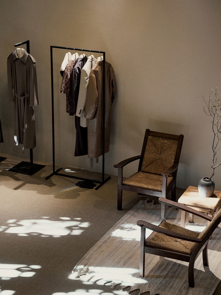 空间陈列延续品牌一贯的设计哲学,将Massimo Dutti 2025秋冬系列成衣巧妙融入整体空间叙事之中。系列单品的精良面料、简约廓形与中性色调,在与空间陈设展开的静默对话中,更显永恒质感。品牌标志性的羊绒与皮革单品,经由精致剪裁的雕琢,不仅仅是简单的衣物,而是构成和谐场域的重要元素,使宾客在游走与驻足间,感受物质背后承载的宁静力量。