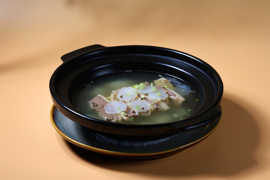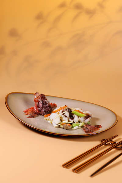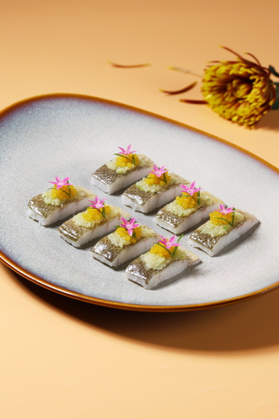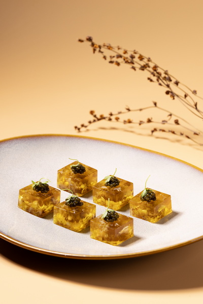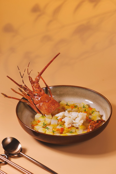 干邑菊花蟹晶凝,酒香萦绕手拆蟹肉,凝作晶莹冻体,点缀杭白菊瓣,入口清雅与醇美交织;酸汤爆珠低温煮黄鱼,采用低温慢煮技法烹制黄鱼,肉质细腻嫩滑。搭配唇间轻抿即刻爆裂的酸汤爆珠,酸鲜开胃口感新颖,为秋日餐桌增添一抹亮色;蟹粉麻腐烧龙虾,现拆蟹粉与弹嫩龙虾相融,麻腐裹满汤汁,清爽中透出海鲜与湖鲜的叠奏;香麻蟹腿酥,金黄酥皮层叠如鳞、薄如蝉翼包裹着饱满的现拆蟹腿肉,蟹肉的清甜在唇齿问绽放,又保留了传统酥点的松脆,堪称秋日茶点的点睛之笔;菜脯油泡石九公,选用新鲜石九公鱼,鱼肉嫩滑,菜脯咸香,既保留了鱼肉的原汁原味,又增添了独特风味。