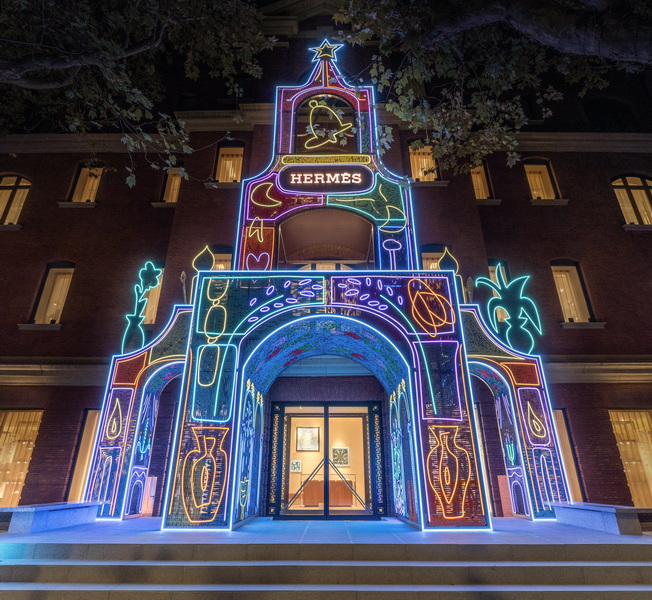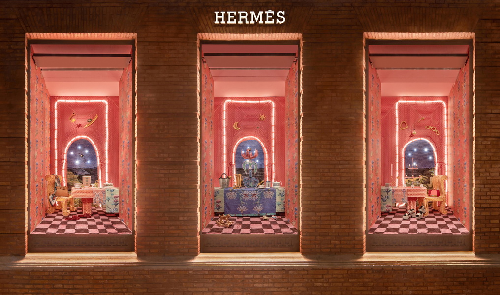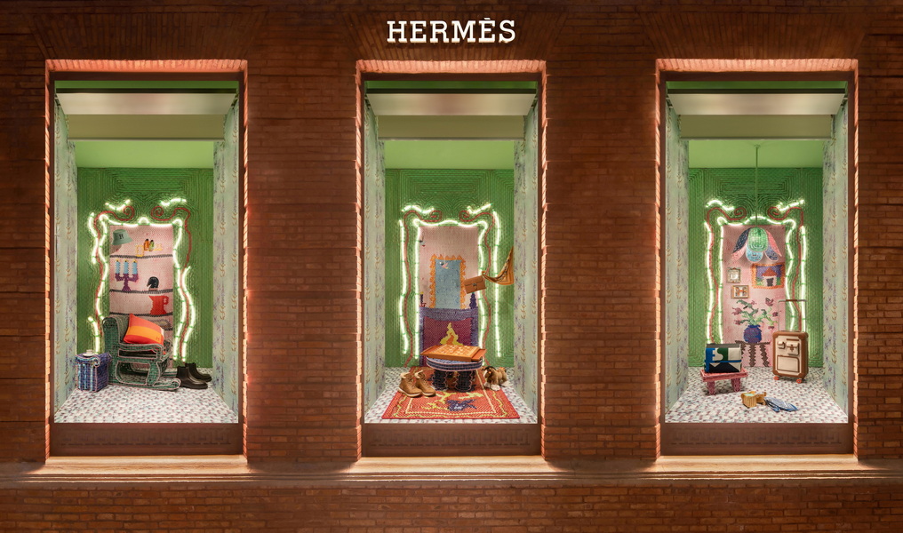 沿用源起于北非和南欧地带的中世纪布条编织技法,Dénéréaz在其既往作品中拆解废旧布料,将之悉心重构为满载记忆和柔情的织毯。橱窗内,如壁画般延展的南法生活画卷亦模拟织毯的肌理,日常物件在五彩灯光的映照下获得新意,转化为亲密而温馨的节日注脚。丝线交织,经纬纵横,Dénéréaz的创作是一条跨越时间与地域的丝路,串联起品牌丝巾制作传统,展现了以艺术美学承续文化脉络的爱马仕精神。