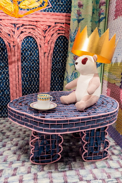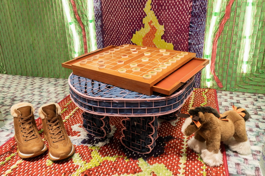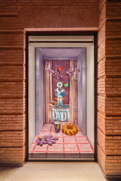 本次创作中,艺术家延续其标志性编织手法,又辅以童趣涂鸦和符号拼贴,渲染普罗旺斯的节庆意象、斑斓色彩与家的温度。男性世界橱窗邀请人们加入节日前夜的燃木仪式:火光轻曳,Samarcande迷你棋盒静候冬夜对弈;枝叶疏朗,Clic H手镯点亮起居日常。移步至餐厅,访客在女性世界橱窗的晚宴桌前落座:丝润晶透唇膏化身缤纷甜点,Tressages Equestres系列餐瓷盛放象征丰收与感恩的佳肴。帘幕之外,引导之星点亮配饰橱窗,传统节庆糕点寓意团聚与永续,为 Mini Medor手提包加冕。