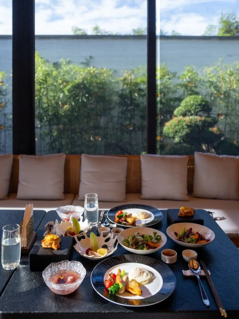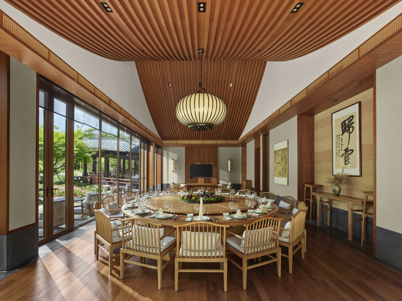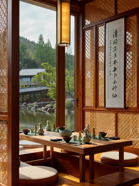 酒店注重将禅茶文化融入每一个细节:径观堂餐厅甄选径山三宝入饌,秉承”不時不食”的理念,演绎杭帮独特风味与在地素食美学。