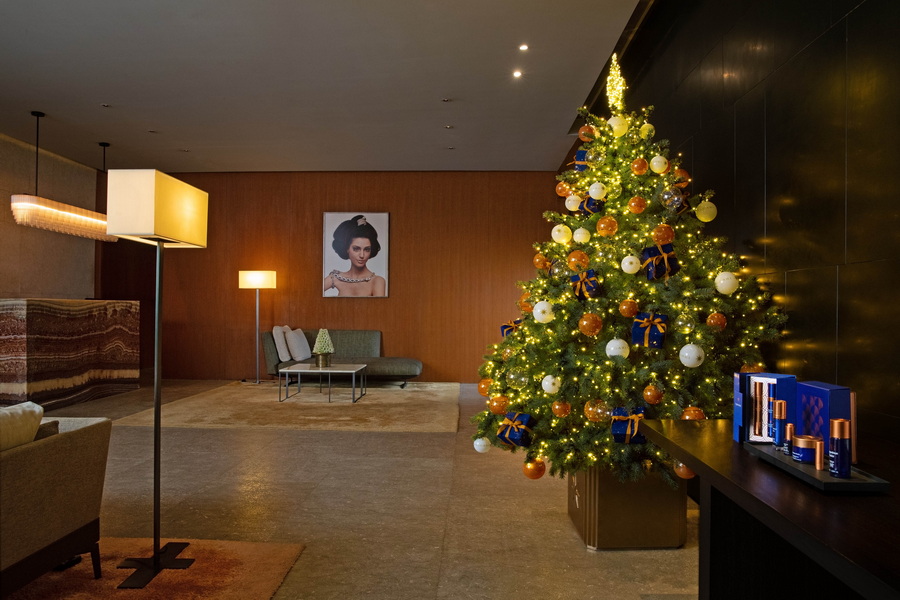 宝格丽雪橇以优雅线条与精巧细节,静驻于大堂,为华美空间增添一抹灵动意趣。一棵树龄逾三十年、高约五米的科罗拉多蓝杉巍然矗立,成为宽敞空间的视觉焦点。树上饰以缤纷节日彩球,顶部镶嵌经典八芒星,与精心布置的蓝色礼盒及节日小屋共同勾勒出静谧而欢愉的节日画卷,续写宝格丽的当代风华。