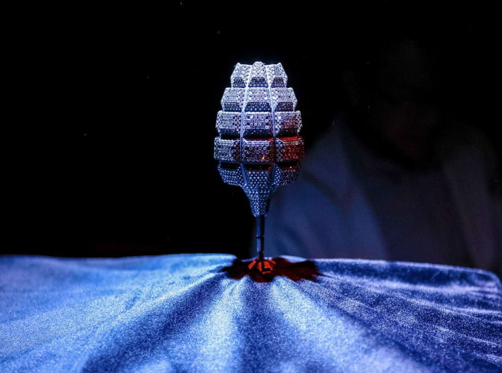 每一件作品亦是可触摸的哲学命题。《长暮星滞》探讨异星节律下人类的存在边界;《羽裘》质问价值判断的脆弱与荒诞;展览收尾部分的高潮《幻驱》将模拟手雷的保险销暗藏内里,指代欲望的开关,与镶嵌在外部的超过3281颗钻石,共同呈现璀璨外形之下的哲学追问,揭示欲望那危险而迷人的双重本性。