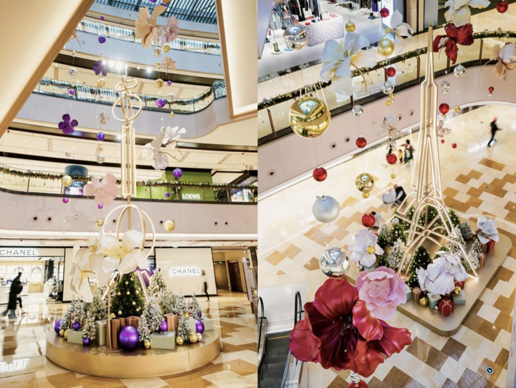 《对话/Dialogue》艺术装置位于兴业太古汇LG1中厅,两座取材自上海及巴黎地标建筑的光影装置彼此对望,装置之上,东方玉兰与法式鸢尾两种花卉吊坠其间,呼应中法文化“以简驭繁”的美学哲思,在充满祝福的节日季中,营造出跨越地域、语言与文化的诗意氛围。花卉由具备中法创作背景的艺术家蔡雅玲以玻璃等综合媒材创造,柔韧轻盈的花卉,与塔形构架的金属材质之间形成张力。塔象征着稳固的文化框架与历史叙事,而双城市花则代表了流动与再造的文化活力,绚丽光影跃动之间,巴黎巴洛克宫廷的华丽与上海海派都会的摩登并置,完成一场跨洋双城记的文化叙事。