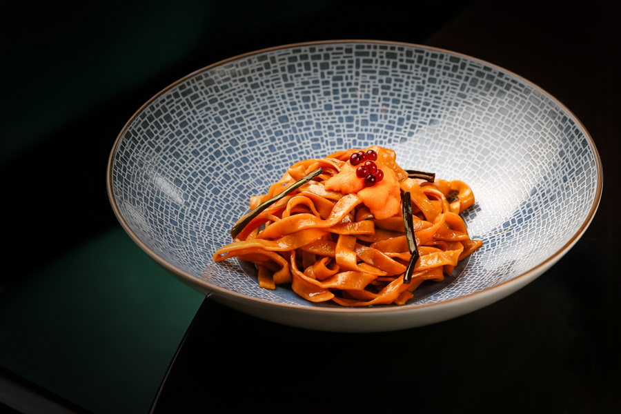 主食 “上海葱油拌手工意面配海胆” 是 中式调味加西式形态的巧妙结合。上海葱油的焦香渗入手工意面的每一道纹理,主厨选取京葱、小葱、洋葱和干葱头复合搭配,让熟悉的葱油香里藏着惊喜层次,海胆作为灵魂浇头,绵密中增添醇厚感,恰如 传统与创新的共生。