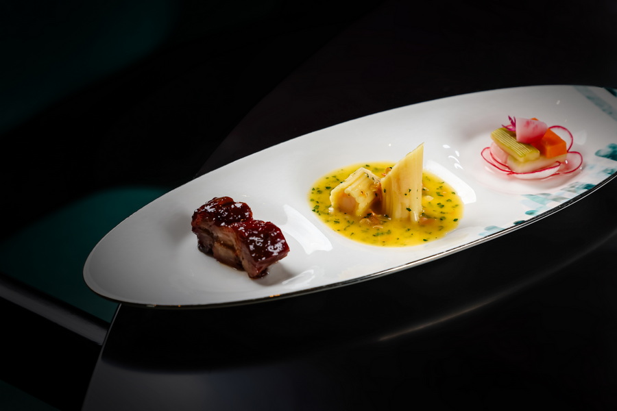 这场晚宴的灵魂,在于东西碰撞的大胆尝试 ,并非简单的风味叠加,而是让粤式烹饪的底蕴与西方食材、技法对话。前菜三拼中,“御苑招牌叉烧” 以传统粤式炉烤工艺呈现,肉质油润而不腻,蜜汁在唇齿间留下焦香;与之并列的 “意式虾卷蛤蜊汁” 则以酒店水岸意大利餐厅的地中海风味呼应,鲜虾的弹嫩裹在意大利面卷中,蛤蜊汁的鲜咸渗透每一丝肌理,两种风味在餐盘上形成奇妙共鸣。