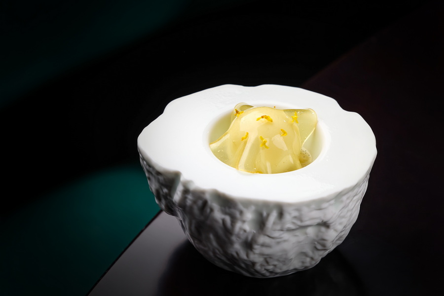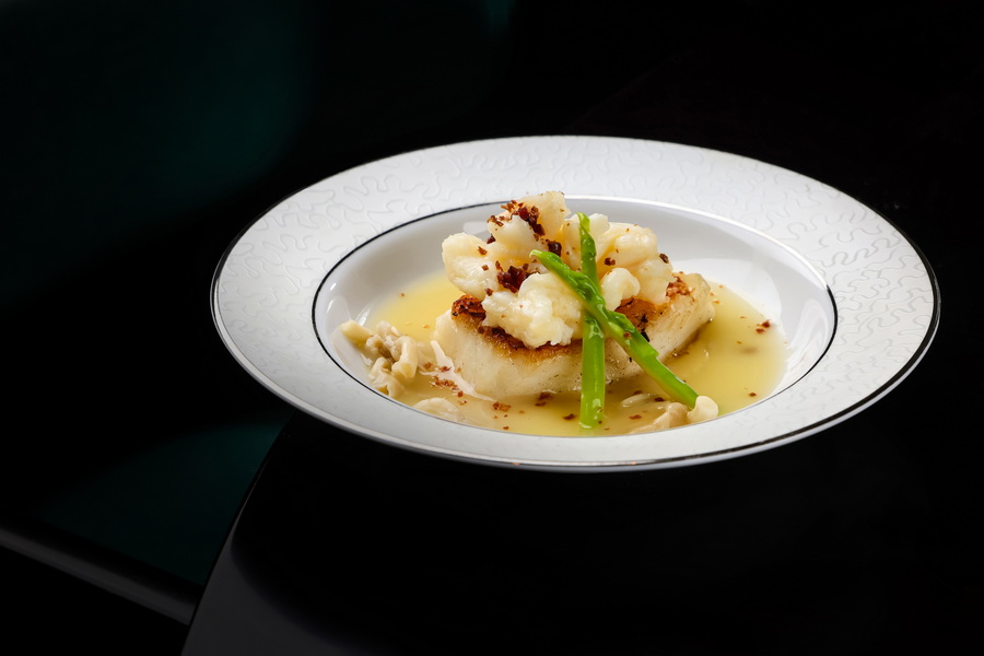 海鲜的呈现也是独树一帜,“香煎南极犬牙鱼配高汤烩龙虾球” 中,主厨选用珍贵的澳洲龙虾与南极犬牙鱼 —— 后者每年限量捕捞,饱含丰富油脂及 Omega-3。两种海鲜以中西烹饪方式融会贯通,先将腌制后的犬牙鱼煎至金黄酥脆,再浇上鸡油菌和龙虾球烩煮而成的浓郁汤汁,辅以几粒话梅肉点缀。酥脆的鱼肉与顺滑的龙虾浇头在舌尖相遇,两种海鲜的鲜香甜美在口腔中蔓延,还有一丝酸甜的梅香淡淡萦绕,风味宛如山水画般回味无穷。