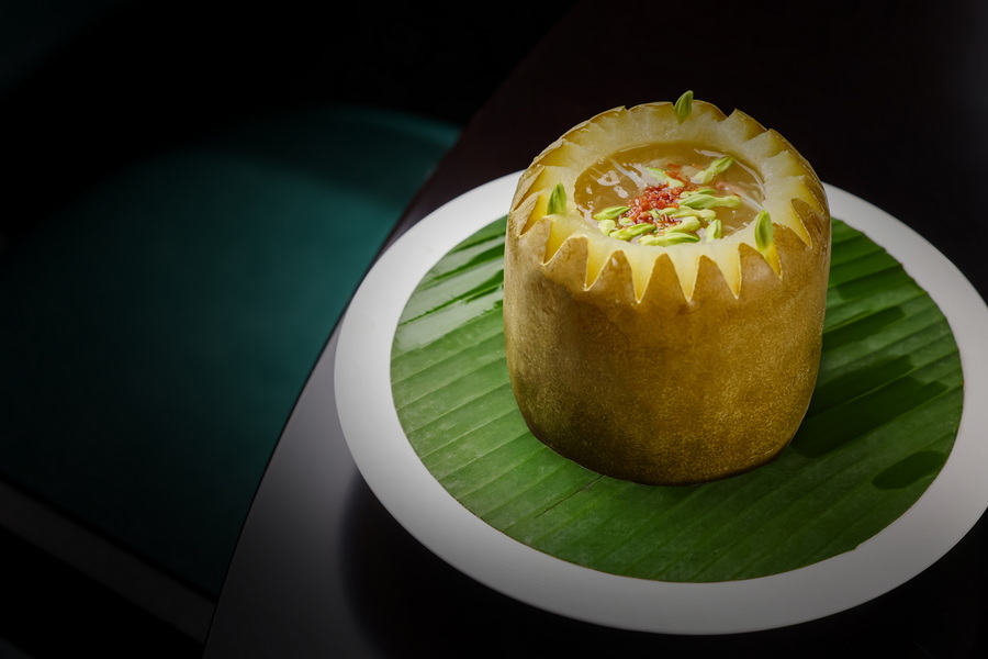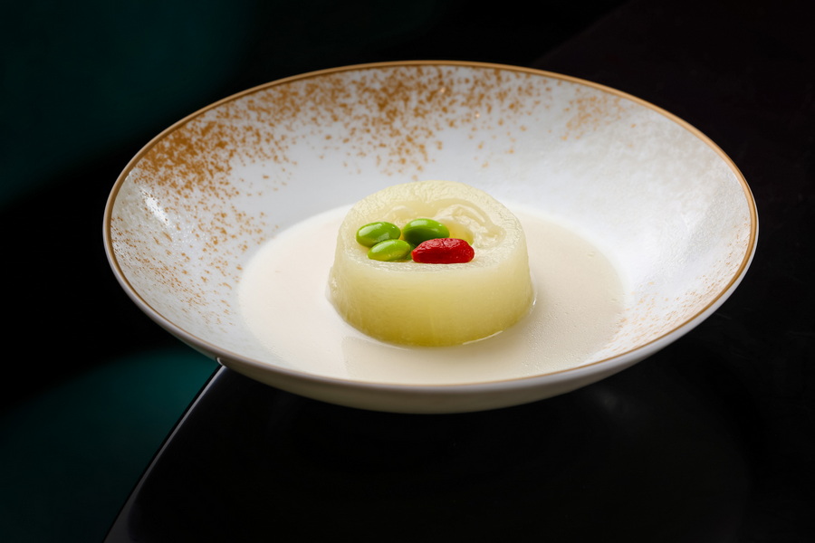 汤品 “蟹肉冬瓜羹” 则将夏季的 “清” 与 “鲜” 推向极致,主厨选取六两左右的初熟冬瓜,清甜无比,加入由响螺、金华火腿、田鸡、日本扇贝等近十味山珍海味熬制的高汤,再融入松叶蟹的醇厚蟹肉。羹体细腻如绸缎,入口即化时带着淡淡回甘,一碗下肚,暑气便随温热的汤汁渐渐消散。