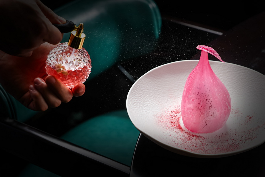 主菜之后用于清口的“荔枝椰青酒酿冰霜”也超越期待,成为本场晚宴的点睛之笔。 选取当季荔枝汁水,与大溪地香草籽混合作为基底,将古法酒酿的清甜与椰青的清冽以西式雪芭技法融合,带着微醺感的冰爽中透着自然果香,堪称 “舌尖上的降温剂”。