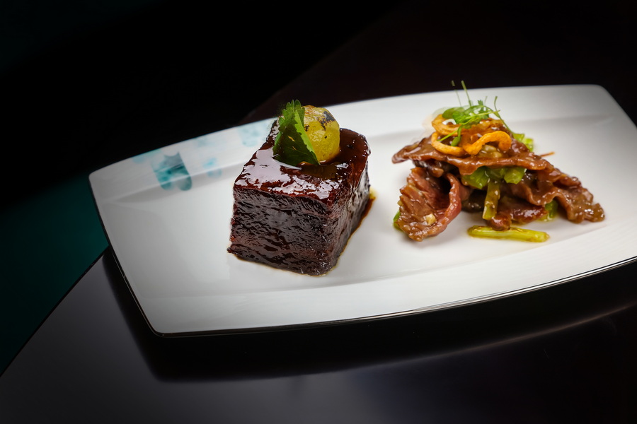 主菜更是将这场东西合璧的盛宴推向高潮。“马陆葡萄慢煨澳洲和牛肋排” 选用上海本地马陆葡萄的清甜酱汁,以低温慢煮方式慢煨澳洲和牛肋排,葡萄的果酸巧妙化解和牛的油脂,肉质酥软到用刀轻划即开,每一口都带着果香与肉香的交融。“白兰地爆潮汕吊龙” 在创新之外,亦未脱离粤式餐饮的传统根基,以 “延续传统,突破革新” 的理念让经典焕发新生。主厨选取鲜嫩的吊龙部位,以精准刀工和火候把控保留原汁原味,加入西方烈酒激发中式牛肉的鲜香 —— 潮汕吊龙的嫩与白兰地的醇厚碰撞,火光炙烤后的焦香萦绕鼻尖,展现 中西共舞的烟火气。