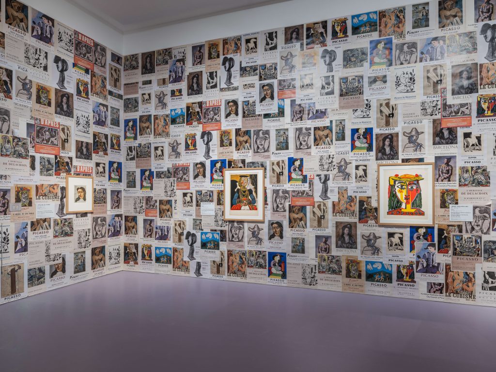 展墙本身成为跨界对话的载体:在“古典主义画家”主题空间中,素描作品密集悬挂,灵感来自巴黎沙龙的经典陈列,同时呼应Paul Smith店铺中的“艺术墙”理念,实现传统与现代的平行对话;在“条纹”主题空间,毕加索作品中的线条与保罗标志性的彩色条纹叠加,形成图案与图案的互动;部分展厅则借鉴巴黎街头的“城市牛皮癣”手法,贴满毕加索历史展览海报,以直白的重复制造视觉冲击。这些设计不仅融合了两位艺术家的视觉元素,更让观展体验本身成为一场沉浸式、充满节奏与情感的视觉旅程。