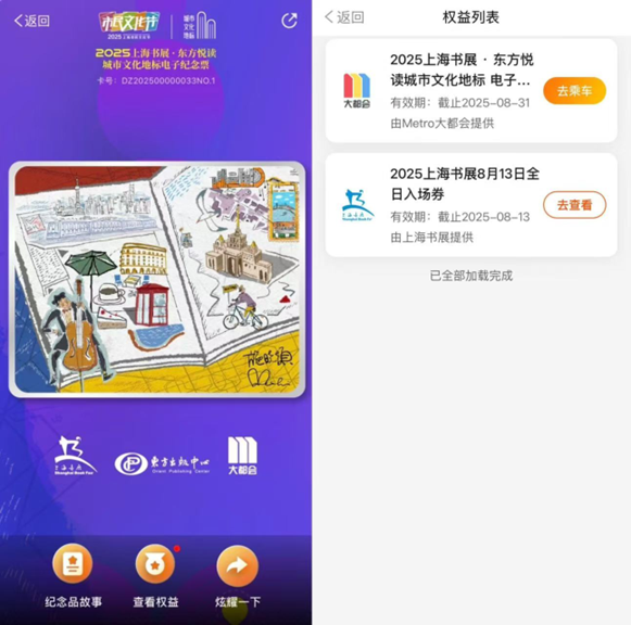 活动同期,上海地铁官方APP“Metro大都会”推出“2025上海书展·东方悦读城市文化地标”主题电子纪念票,限量发售。持票者可享以下双重权益: