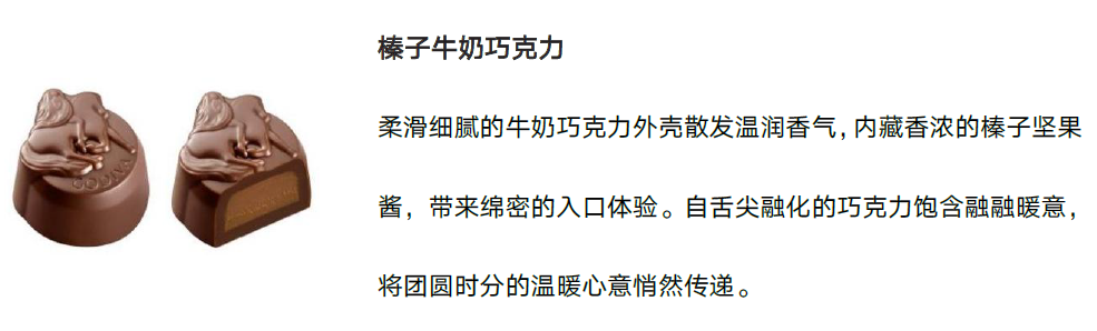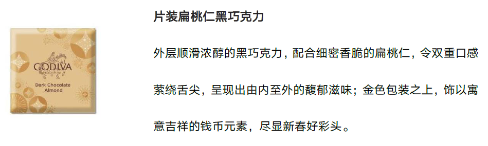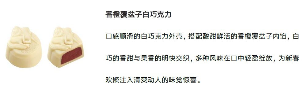 此次,歌帝梵巧克力大师以马背上的Godiva夫人为灵感,将这一优雅形象化为巧克力上的精致浮雕,在致敬品牌创意精神的同时,寄予“马到成功”的美好寓意。甄选黑巧克力、白巧克力与牛奶巧克力,巧妙融合焦糖的馥郁、坚果的香浓与水果的清新等,渐次绽放多重风味,缔造出兼具视觉美感与味觉享受的当代巧克力体验。