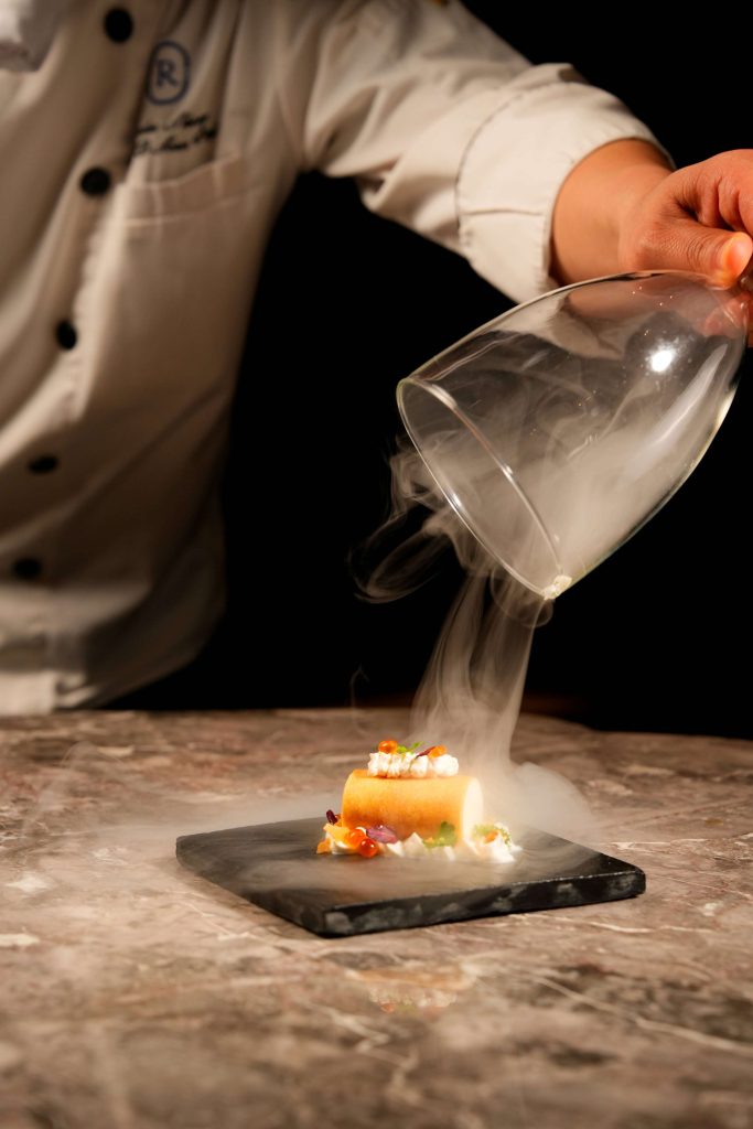 Code fish mousse spring roll | Lemon truffle oil, salmon caviar, microgreen