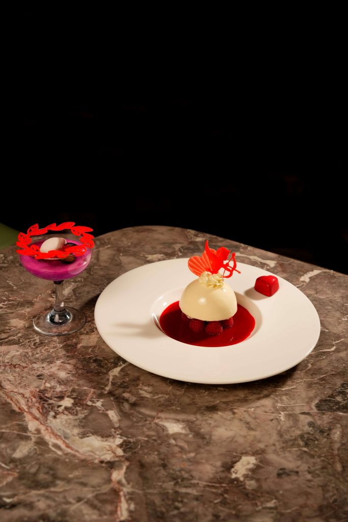 镜面椰子慕斯蛋糕配覆盆子,意式蛋白酥,巧克力心片伴草莓汁(右)