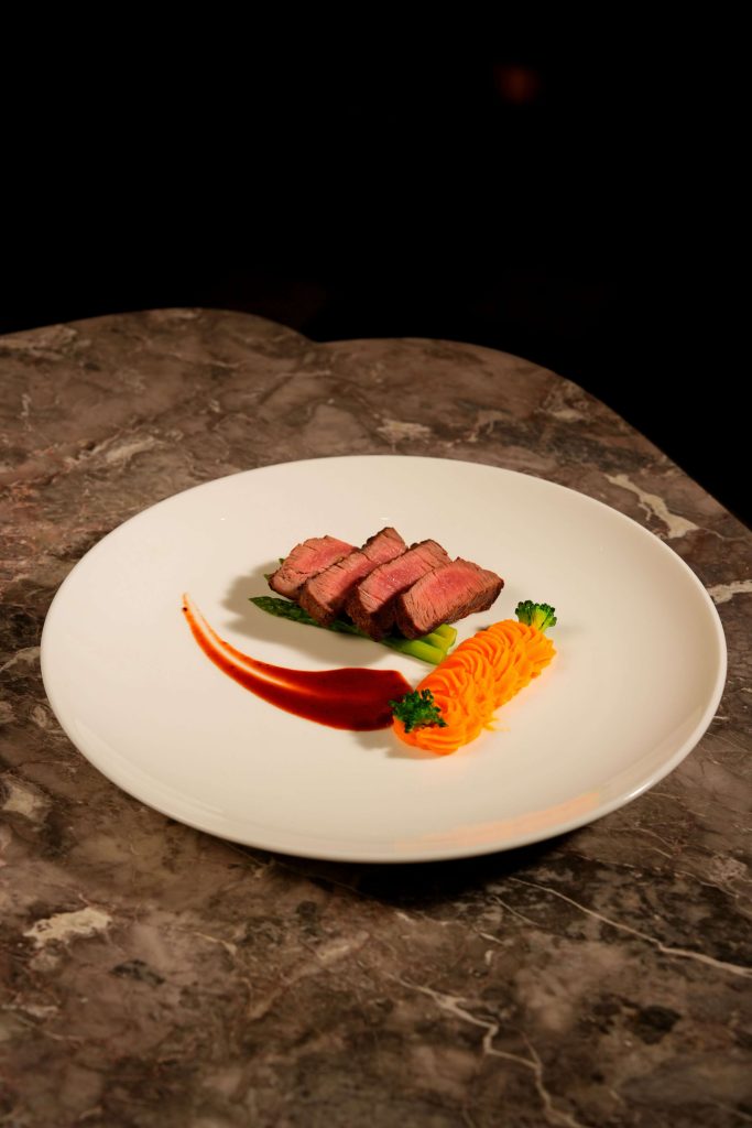 主菜嫩煎 M5 牛柳诚意满满,肉质细嫩多汁,搭配绵密的胡萝卜土豆泥与清爽时蔬,淋上经典红酒酱汁,每一口都是高端食材的本真风味。