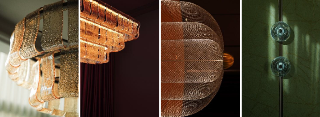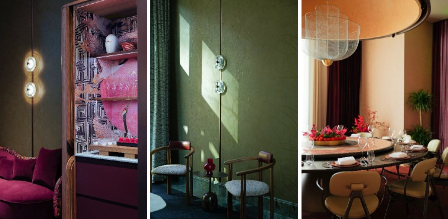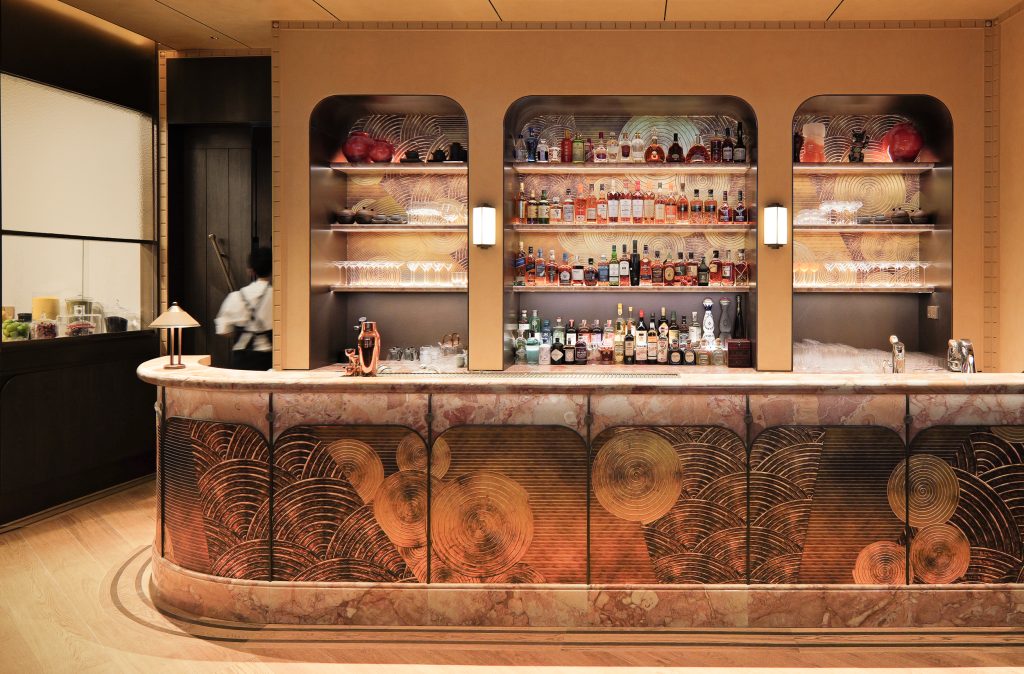 随堂里以三重空间层次重新定义现代用餐体验。全新打造的一层私宴包厢由澳洲知名设计工作室Mitchell & Eades操刀,以摩登雅致的笔触,重现上海里弄的温情与趣味。设计从当代上海文化中汲取灵感,将旗袍盘扣等精致元素巧妙融入Art Deco的几何线条之中,于细节处彰显匠心。空间以暖褐色为主调,搭配水波纹玻璃隔断、定制几何纹样地毯与柔和的间接照明,营造出既私密又通透的视觉效果。四间主题包厢分别以“暖褐”、 “沁白”、“釉青” 与“胭紫”与命名,各具特色——“暖褐”延续酒吧区的视觉语言,长桌的布局呈现自在随性的氛围,“沁白”与“釉青”间的可开合屏风则实现空间的灵活转换,满足从私密家宴到半开放酒会的多元需求,而”胭紫”包厢的悬浮式穹顶赋予空间戏剧张力。