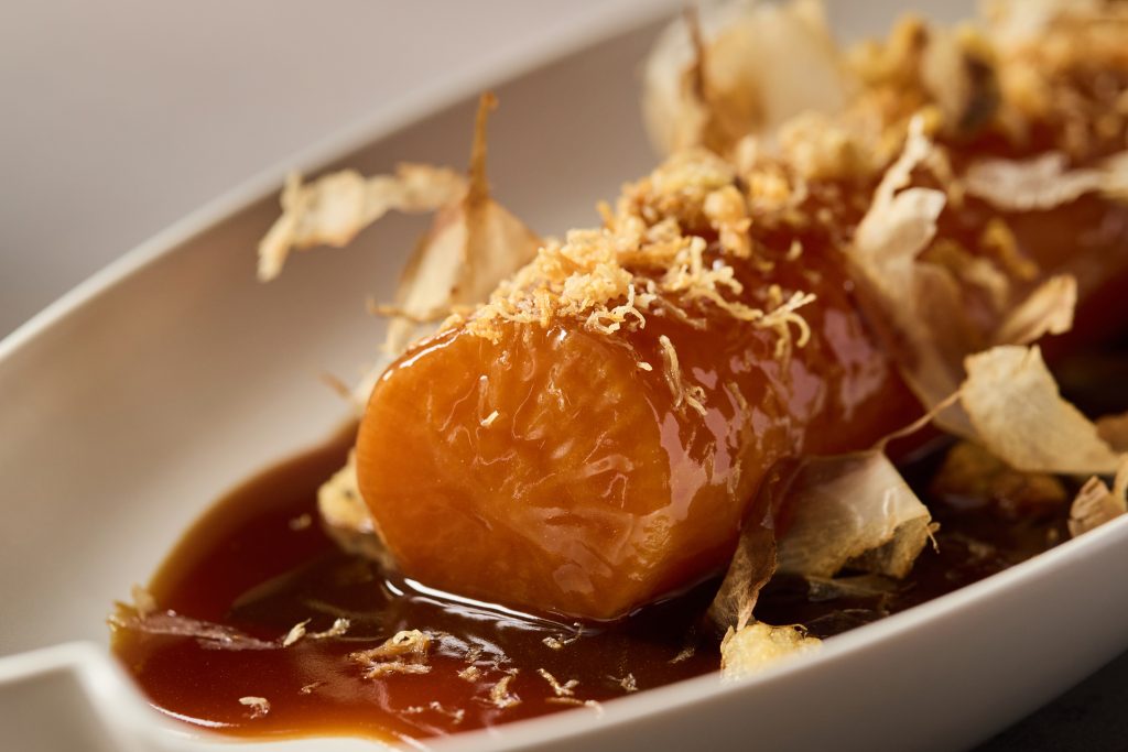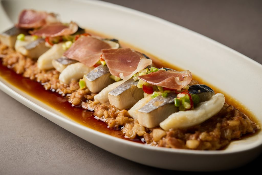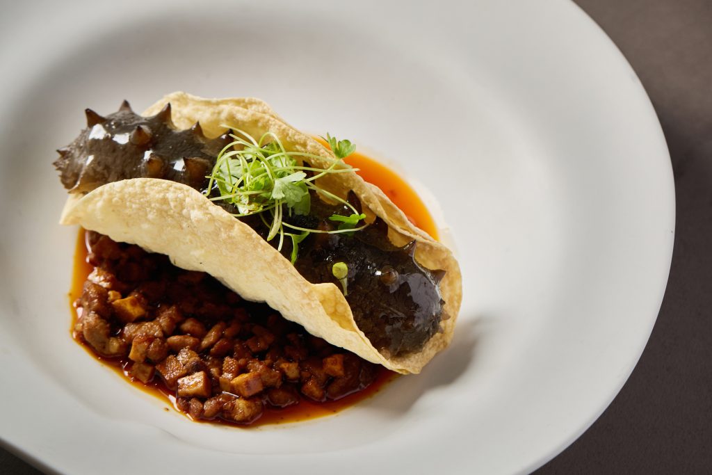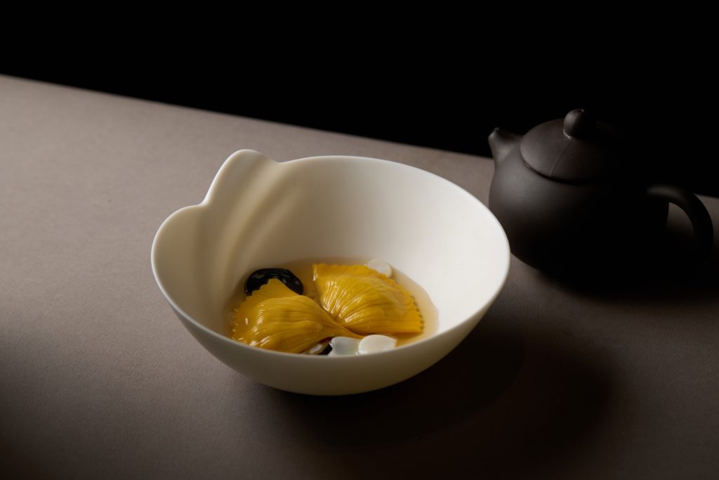 在叶剑主厨的掌勺下,随堂里的菜单始终以上海菜与粤菜为坚实根基,并巧妙融入各地风味灵感,通过不定期推出的地域主题菜单,为食客带来常换常新的味觉惊喜。本季,叶师傅将游历齐鲁大地的见闻化为全新注脚,融合了渤海湾的鲜味与山东田野的质朴。他并非简单复刻传统,而是以当代视角进行创意转译——例如,以胶东经典的鲅鱼水饺为原型,搭配云南酸汤,赋予其清澈酸爽的新意;用碳烤技法处理中式熟成的渤海湾黄鱼,佐以藤椒芥末酱,碰撞出令人惊喜的现代活力;将胶州白菜与渤海湾大虾共煨,以乌鱼子粉提鲜,展现陆地与海洋的鲜味交融;甚至将大连海胆融入冰淇淋,搭配黑糖脆米糕,打造咸甜交织的创意甜品。值得一提的是,叶师傅更创新性地使用晒干的海肠磨制成粉,作为本味的提鲜秘器,为菜品增添了深邃的海岸风味。这些新作与备受赞誉的伊比利亚火腿小笼包、慢煮黄酒醉蓝龙等经典菜式一同,构成了随堂里既具底蕴又充满探索精神的味觉宇宙。