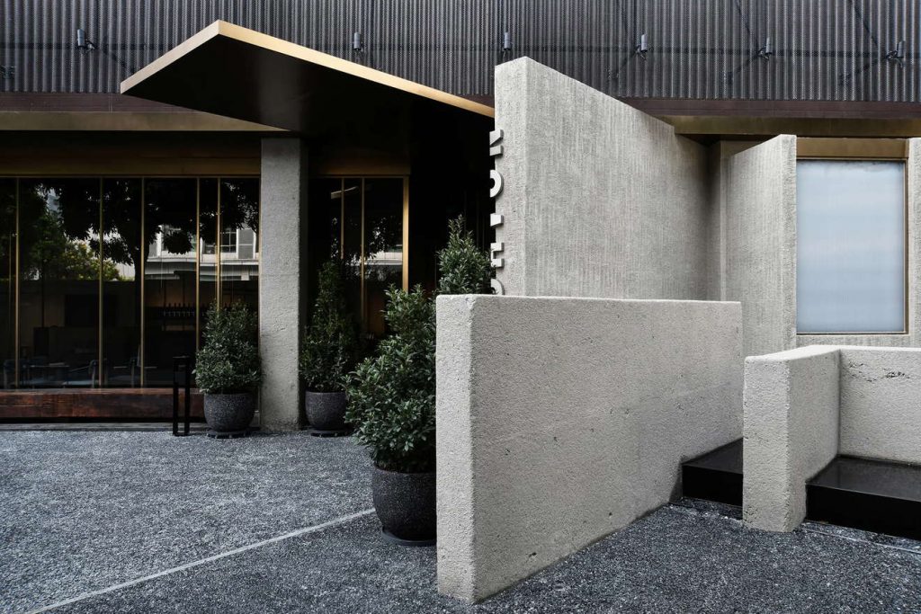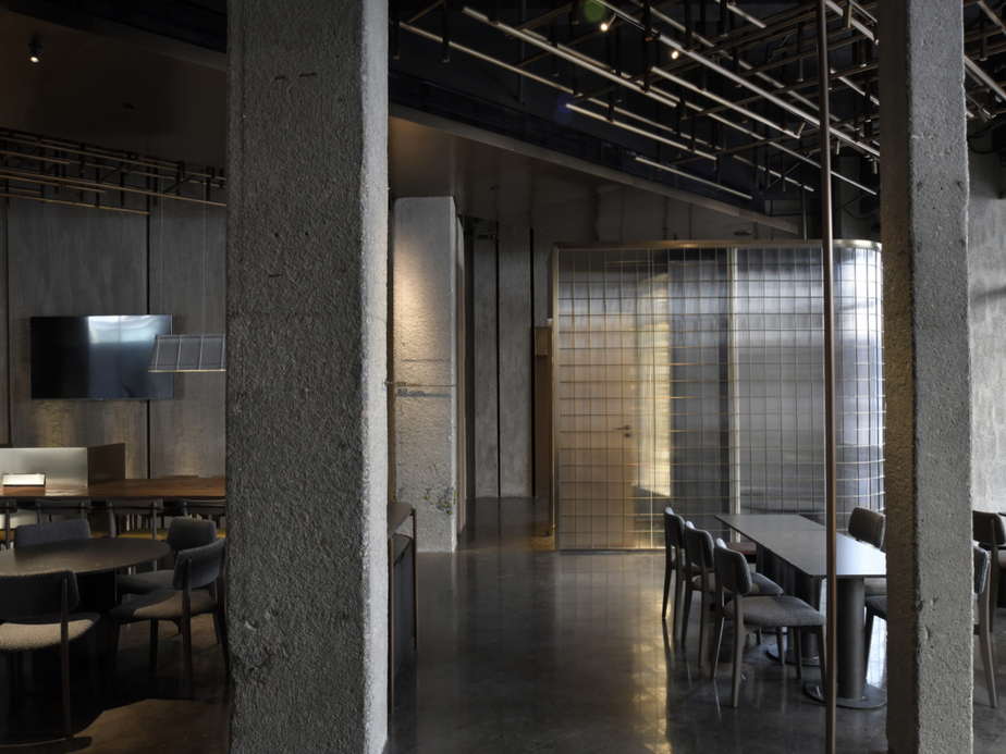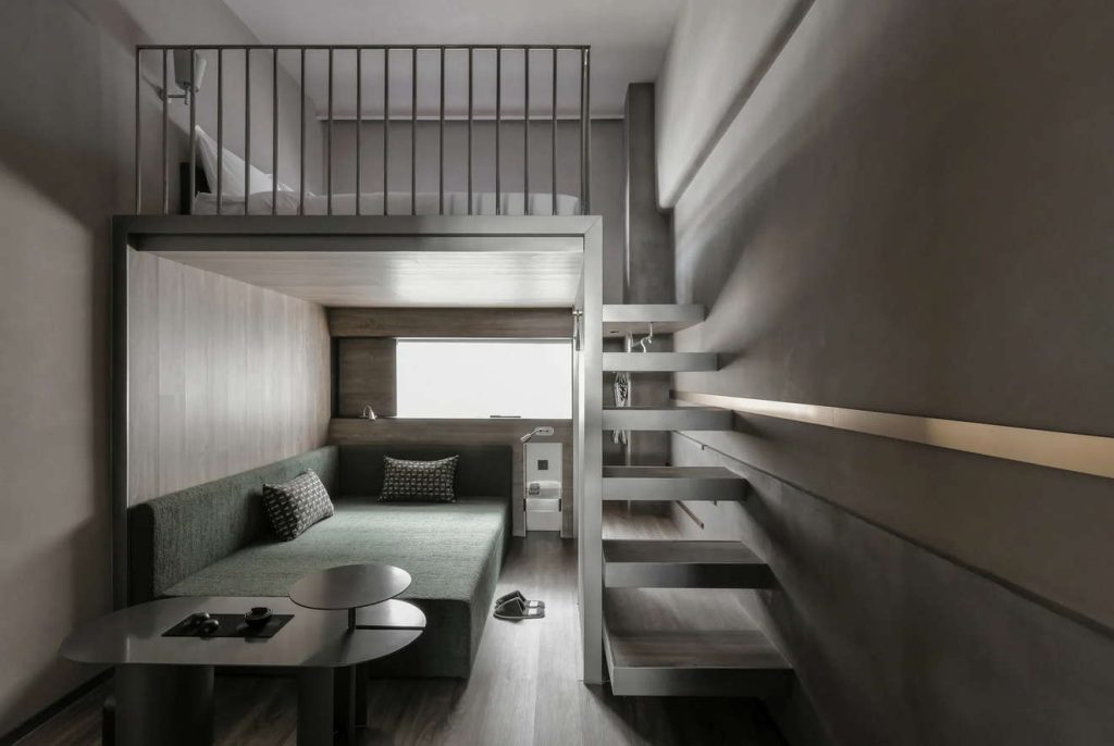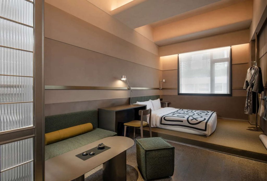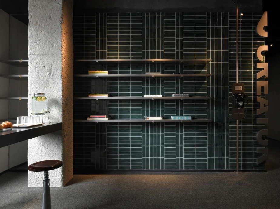 酒店整体设计由著名设计师Leo Li李泷操刀,以深圳早期采石矿区与工业发展为灵感原型,将“采石场”这一城市记忆转译为空间语言。通过斜面切角、砂岩肌理墙面及错落金属横杆的视觉语言,构建出一个抽象而诗性的城市记忆场所,致敬这座城市开山填海、蓬勃生长的拓荒精神。原有工业货梯井道被完整保留,作为贯穿建筑的重要垂直轴线,使工业遗存与当代设计在同一场域中并置共生。