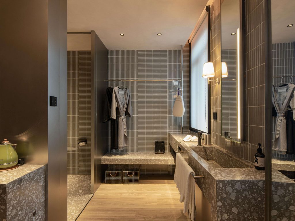 深圳诺岸酒店共设101间客房。大胆的平面结构与精致先锋的设计细节并置,在满足高品质睡眠与沐浴体验的同时,营造出可被感知、可被参与的空间互动感。顶层创意家俱乐部进一步延展居住场景,在客房中嵌入健身魔镜与灵感工具包,回应当代城市旅居者对身心平衡与创造力释放的双重需求。