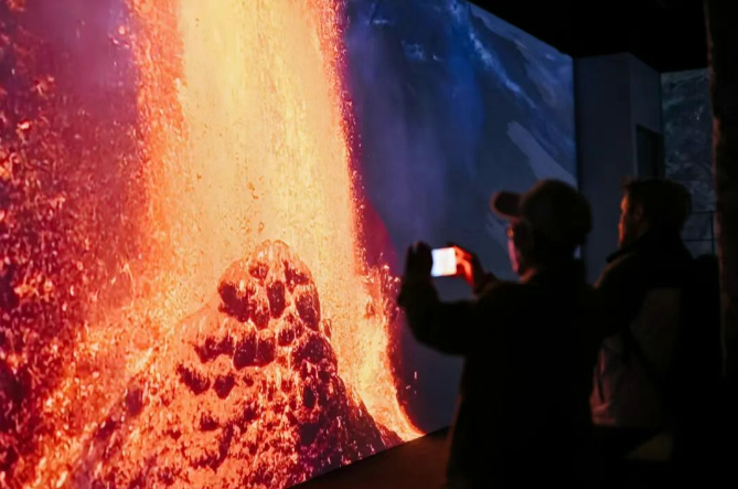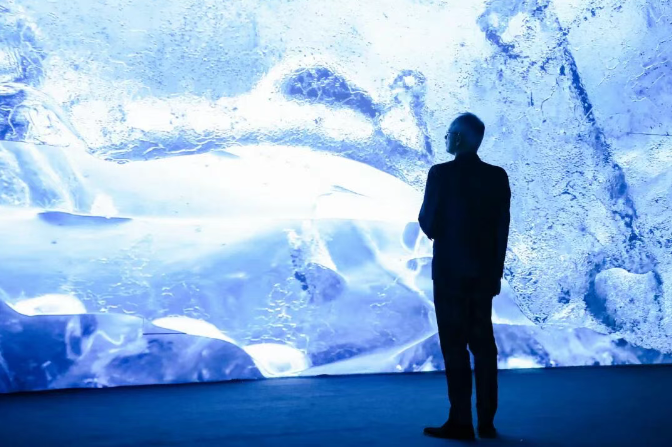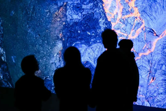 置身于展览现场巨幅屏幕的环绕中,观众仿佛穿梭于时空的裂隙:我们得以近距离深入冰层之中,感受这一存续万年的“时间档案”正在融化、变得混乱;另一边,火山在面前爆发,滚烫熔岩就在身边坠落——这是对“破坏与重塑”最直观的见证。