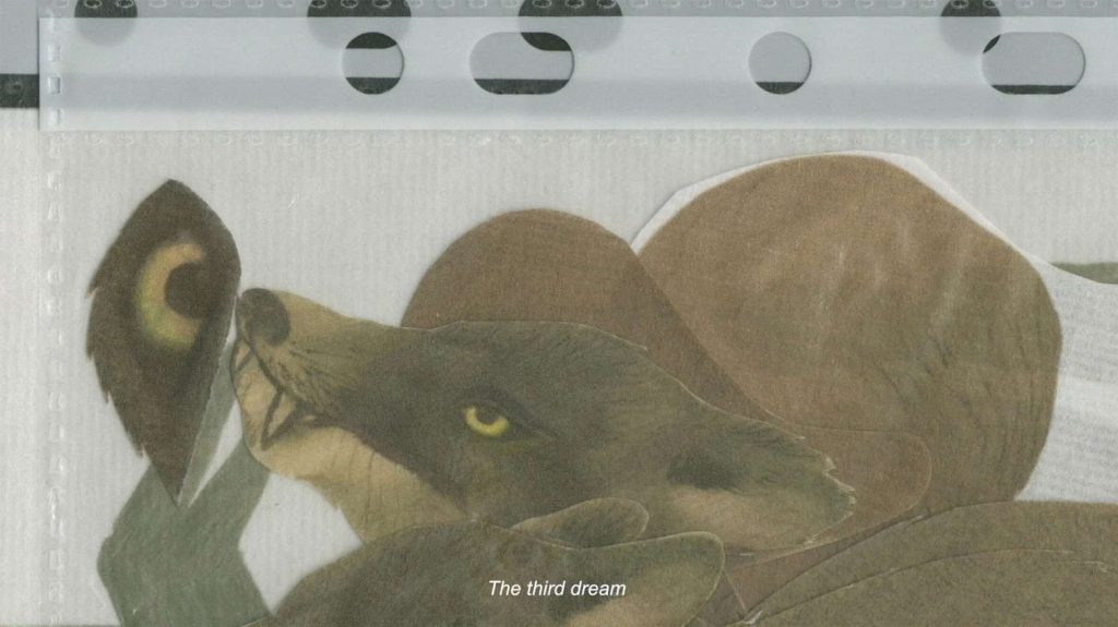 2018年起,柴觅开始重读古老的《伊索寓言》,并将搜集的图像与文本重新拼贴、编织为《A的寓言》系列。这些作品打破了原有的叙事逻辑,邀请观众走出“观看者”的位置,在图像与寓言的交错中,体会不同生命之间的情感联结。如果说《A的寓言》是一场关于叙事结构的冷静推演,那么她在最新影像作品《我忘了但你可以记得》中,则转向了更为私人与诗意的表达。作品以剪纸、拼贴与定格动画的形式,跟随一只被收养的流浪犬的视角,穿插艺术家写给女儿的絮语,在记忆与遗忘之间,轻轻打开一个属于“它者”的梦境。