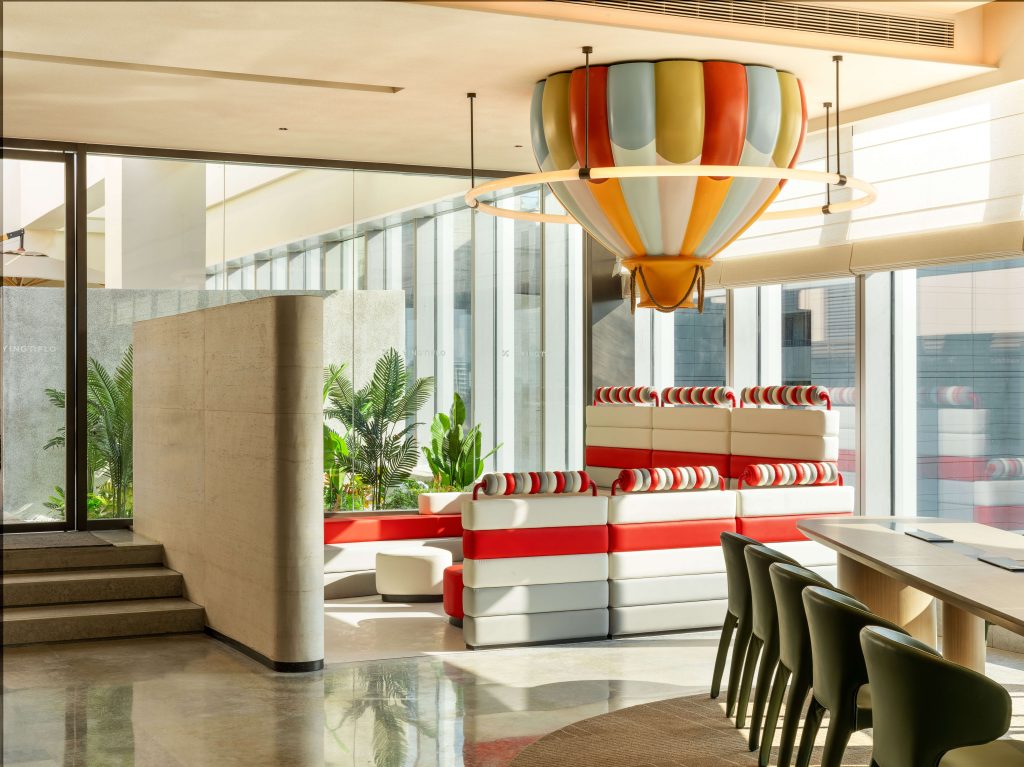 在整体设计上,南京毅风酒店延续品牌标志性黄金分割比例,构筑从容舒展的“自在空间”。经典之外,此次南京毅风酒店在软装上带来创新突破,以品牌红色球体——毅风因子为灵感来源,利用入口处旋转的红色风车、前台摆放的球形灯具、公区城市剪影间悦动的毅风因子等将无形的气息与能量,转化为可感知的存在,串联起从入口到客房的每一处场景,形成一个充满活力的体验空间,以期唤起年轻人对自由和探索的向往,激发他们在空间中的参与感和归属感,同时传递品牌积极向上、随风前行的精神。