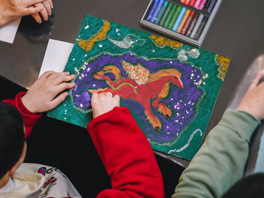 少儿公益艺术大师班以东方“翼马”为灵感,邀请孩子们在宽敞明亮的宝格丽宴会厅挥洒创意。这一双翼腾云、充满力量的形象,自古寄托着对祥瑞与自由的向往。在艺术策展人谢定伟先生的引导下,孩子们将斑斓的彩宝之色赋予象征希望的“翼马”,于充满想象力的笔触中,让中国传统意象与意式经典美学在画布上交汇。创作间隙,酒店精心准备了火腿芝士三明治、开心果蛋糕配海盐奶油和树莓啫喱等意式风味茶点,以精致可口的甜咸美味,陪伴孩子们度过绚丽充实的艺术时光。