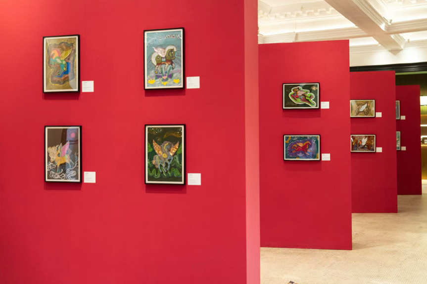 承载童心与情感的36幅画作,悉心陈列于宝格丽宴会厅前厅,汇聚成“意彩童梦”少儿公益艺术展。走进展区,轩敞达127平方米的门厅内,中式马赛克地坪、格纹天顶与星罗棋布的拱形柱列,勾勒出典雅和谐的艺术画面。充沛的光影为每一幅作品带来全新生命,让拥有翅膀的天马,与孩子们的希冀共同奔向美好未来。