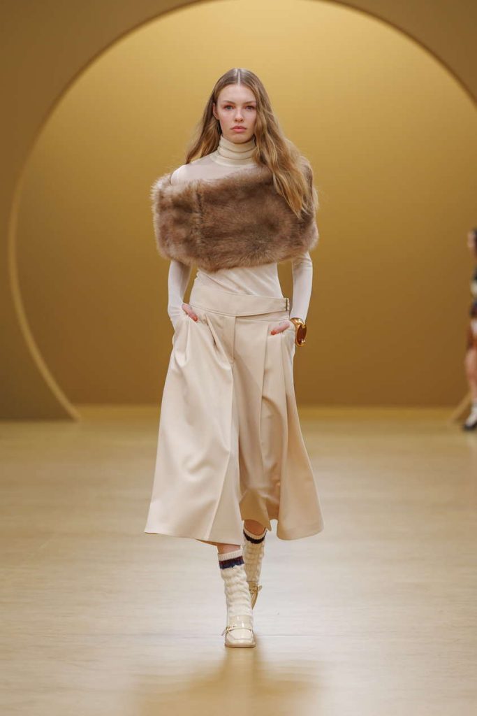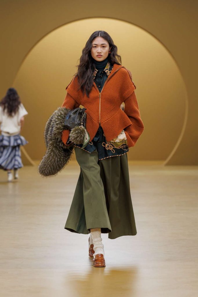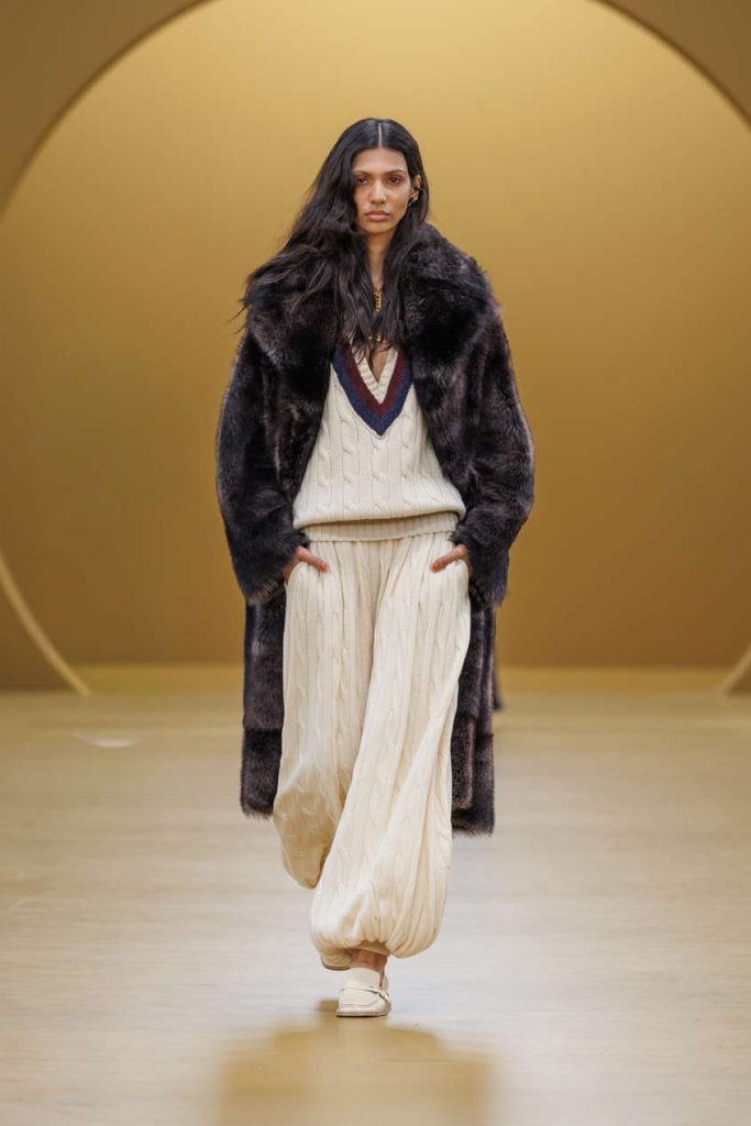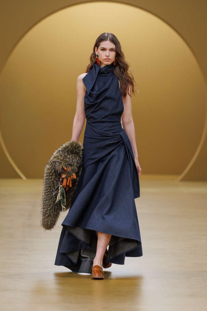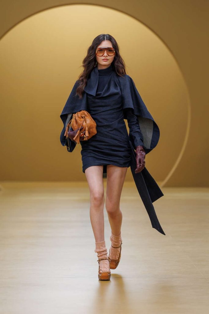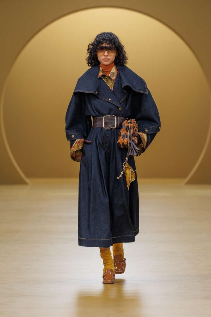 本季设计语言通过层叠艺术得以淋漓呈现:羊羔绒、丝绒与真丝的丰富肌理相互映衬,以叠穿层次感赋予单品多变可能。宽松丹宁连体裤与雕塑感针织之下,贴身内搭与夸张袖型的真丝衬衫层叠交错,于细节间勾勒丰富的视觉叙事。