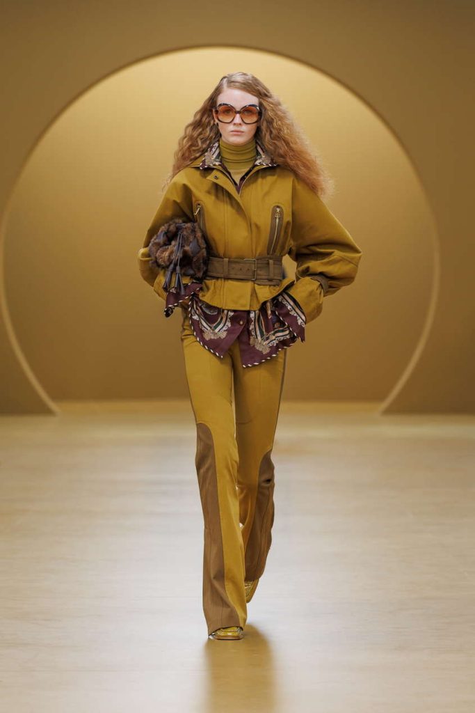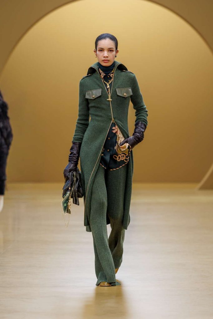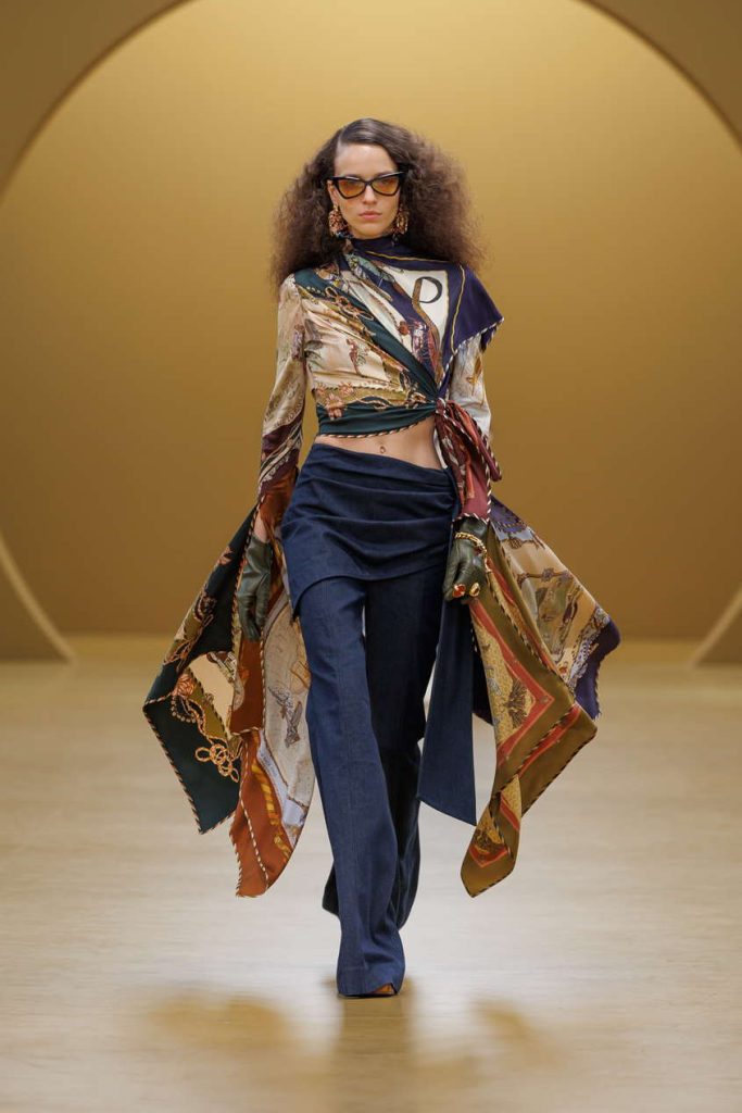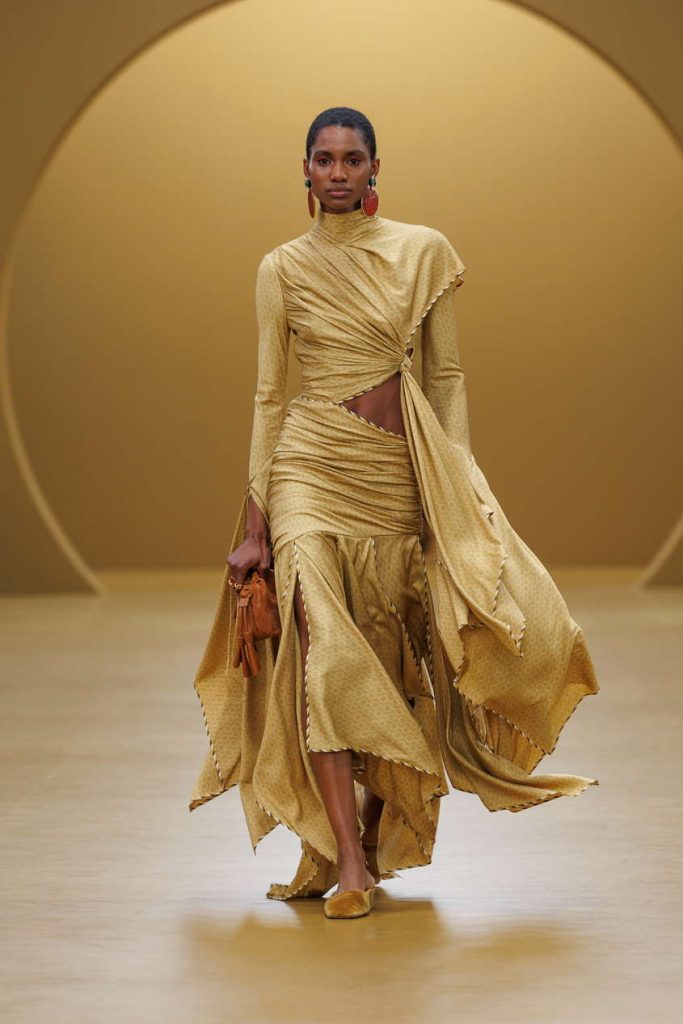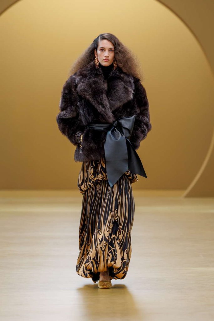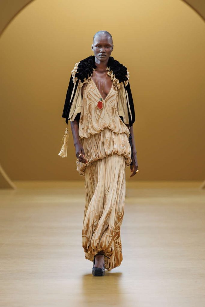 装饰艺术的风格印记悄然浮现于本季印花与廓形之间。手绘纹样以烧花真丝工艺雅致呈现,天鹅绒礼服长裙则以几何镂空设计与真丝雪纺的层叠流泻,隐现那一时代的华丽格调。