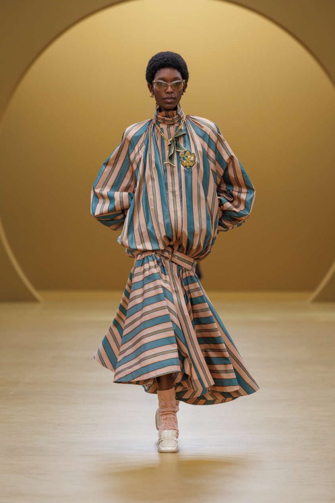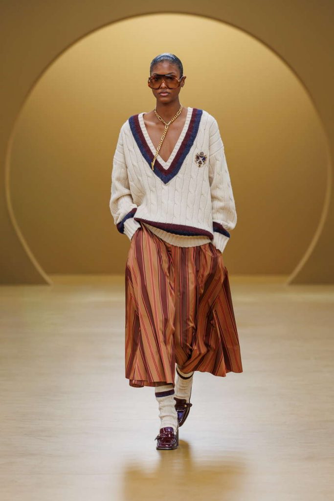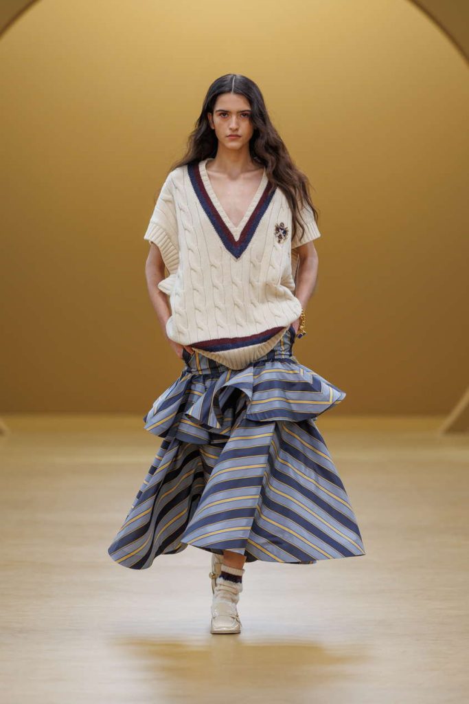 女性化的线条柔和流转,与传统男装元素玩味互文,营造出贯穿始终的微妙平衡。印有航空与运动图样的男士真丝方巾,化作翩然流动的飘逸裙装;利落板球服以奶油色羊毛西装重新诠释,雕塑感的飞行员丹宁夹克从制服着装中汲取灵感,而一套灰绿色斜纹套装则在实用主义中注入柔韧质感。