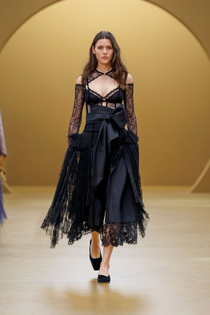 剪裁利落的燕尾服套装以纤巧蕾丝点缀修饰,与精致内搭细节相映成趣。束身廓形造型中,文胸被演绎为外搭单品,构筑出丰盈而富有层次的礼服裙装。