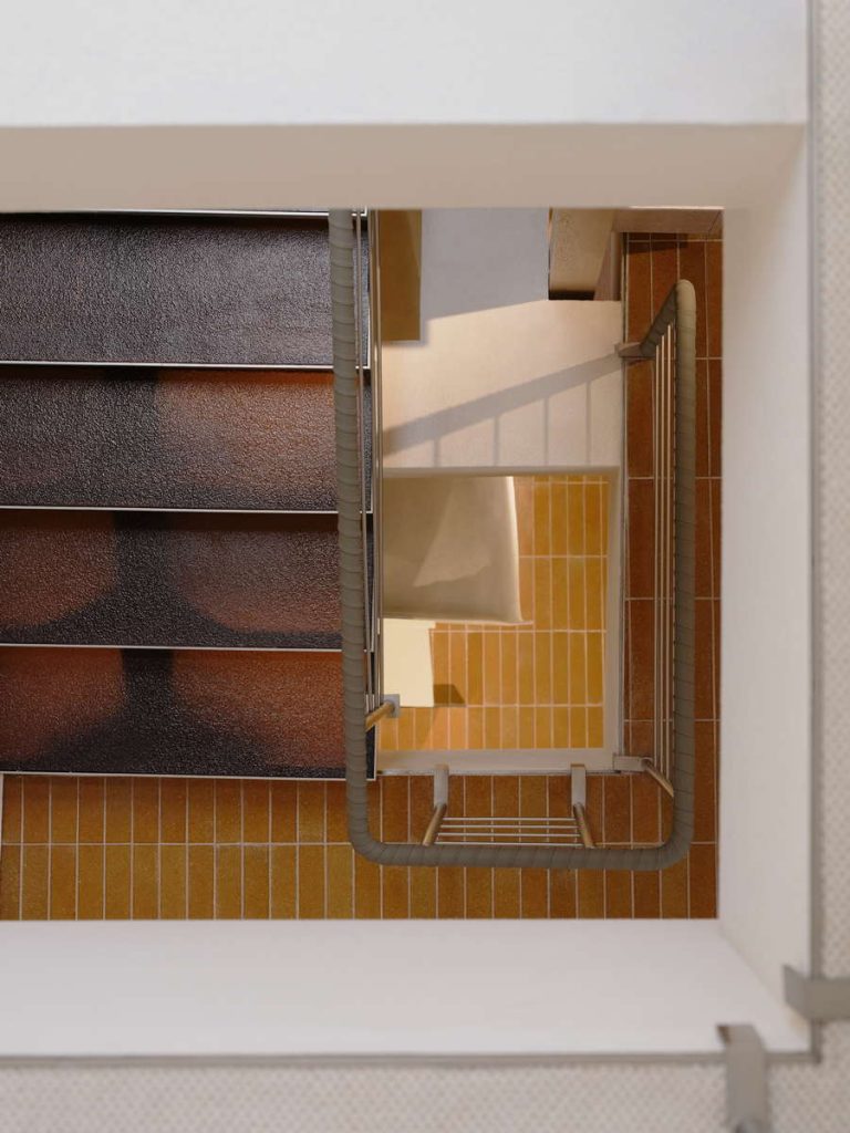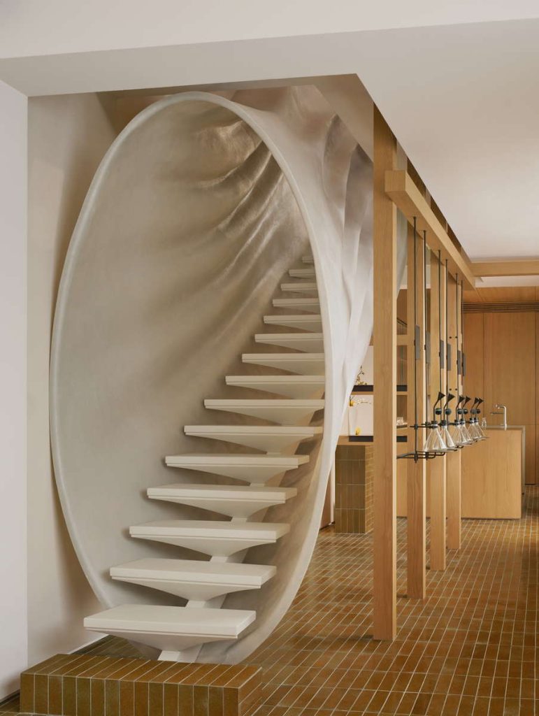 这一理念从产品延伸至空间本身,一二层之间的楼梯采用一体化铸造玻璃钢,形态呈椭圆形扭转,灵感源自品牌“流光白酒杯”的杯身设计——扭转的角度让酒液在杯中流转时风味更丰富。当人拾级而上,身体被扭转的形态包裹,仿佛正品味一杯被认真对待的酒,风味在舌尖流转的微妙,被空间翻译为身体的感知。
