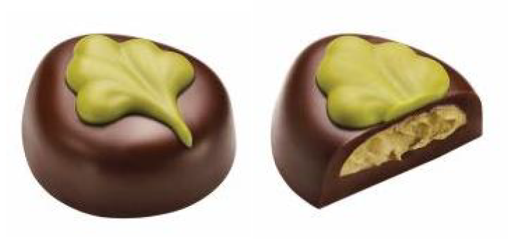 白巧打造的翠色羽毛图案,造型灵感源自电影《乱世佳人》斯嘉丽的经典帽饰;当香浓黑巧邂逅醇香开心果内馅,可可滋味与坚果香气层层交叠,自味蕾间唤醒春日下的盎然生机。